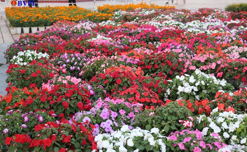Hàng ngàn chậu hoa đa dạng, đủ loại, đủ màu sắc, ngoài mai, cúc, vạn thọ, đồng tiền còn có đỗ quyên, hoa mào gà, hoa cánh bướm,… quy tụ về đường hoa, bung nở trên những lối đi, cho khách tham quan tha hồ thưởng lãm.