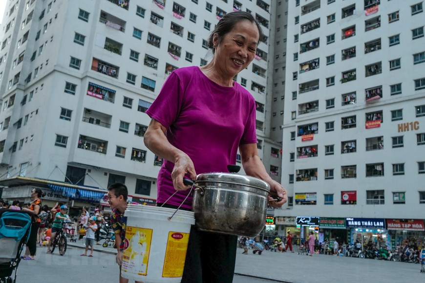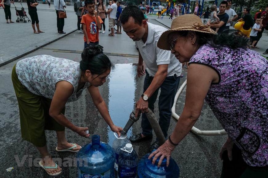 Gần 1 tuần nay, cuộc sống của hàng ngàn hộ dân tại 12 tòa chung cư HH Khu đô thị Linh Đàm (Hà Nội) bị xáo trộn vì nước máy nhiễm mùi lạ. Chính vì vậy, từ 14 - 21 giờ hàng ngày, hàng chục ngàn lít nước sạch đã được cung cấp miễn phí cho người dân khu vực này. (Ảnh: PV/Vietnam+)