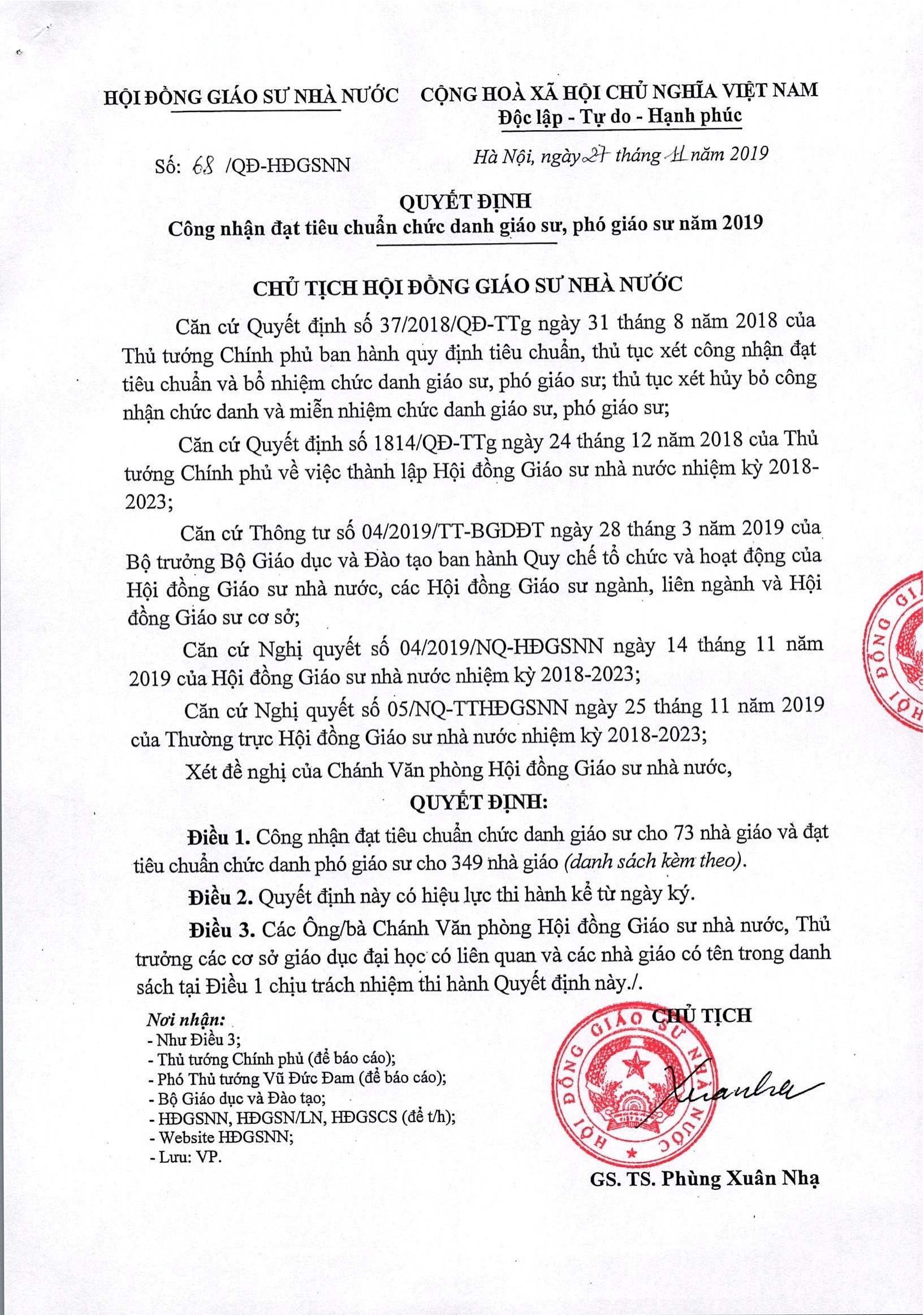 Danh sách các nhà giáo được công nhân đạt tiêu chuẩn chức danh Giáo sư năm 2019