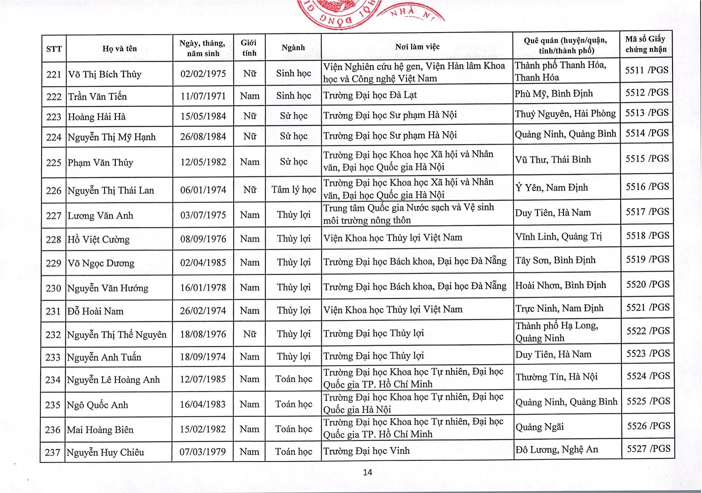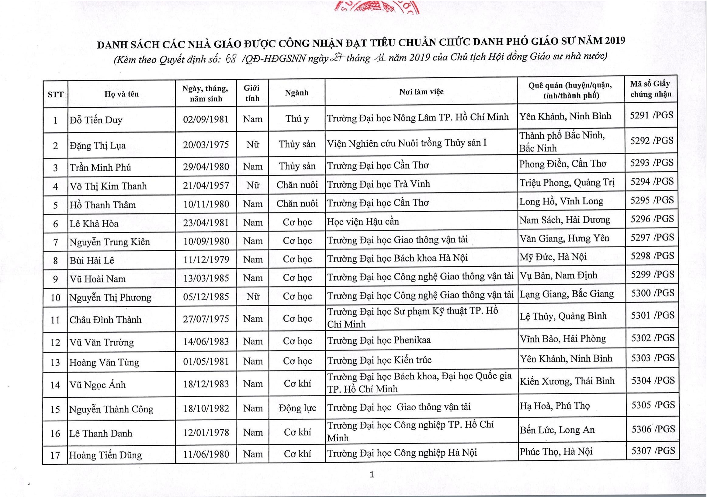 Danh sách các nhà giáo được công nhân đạt tiêu chuẩn chức danh Phó Giáo sư năm 2019
