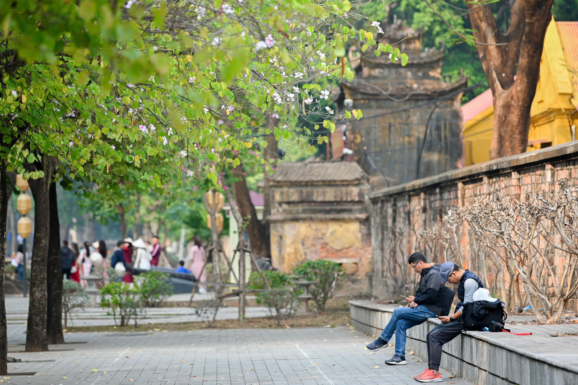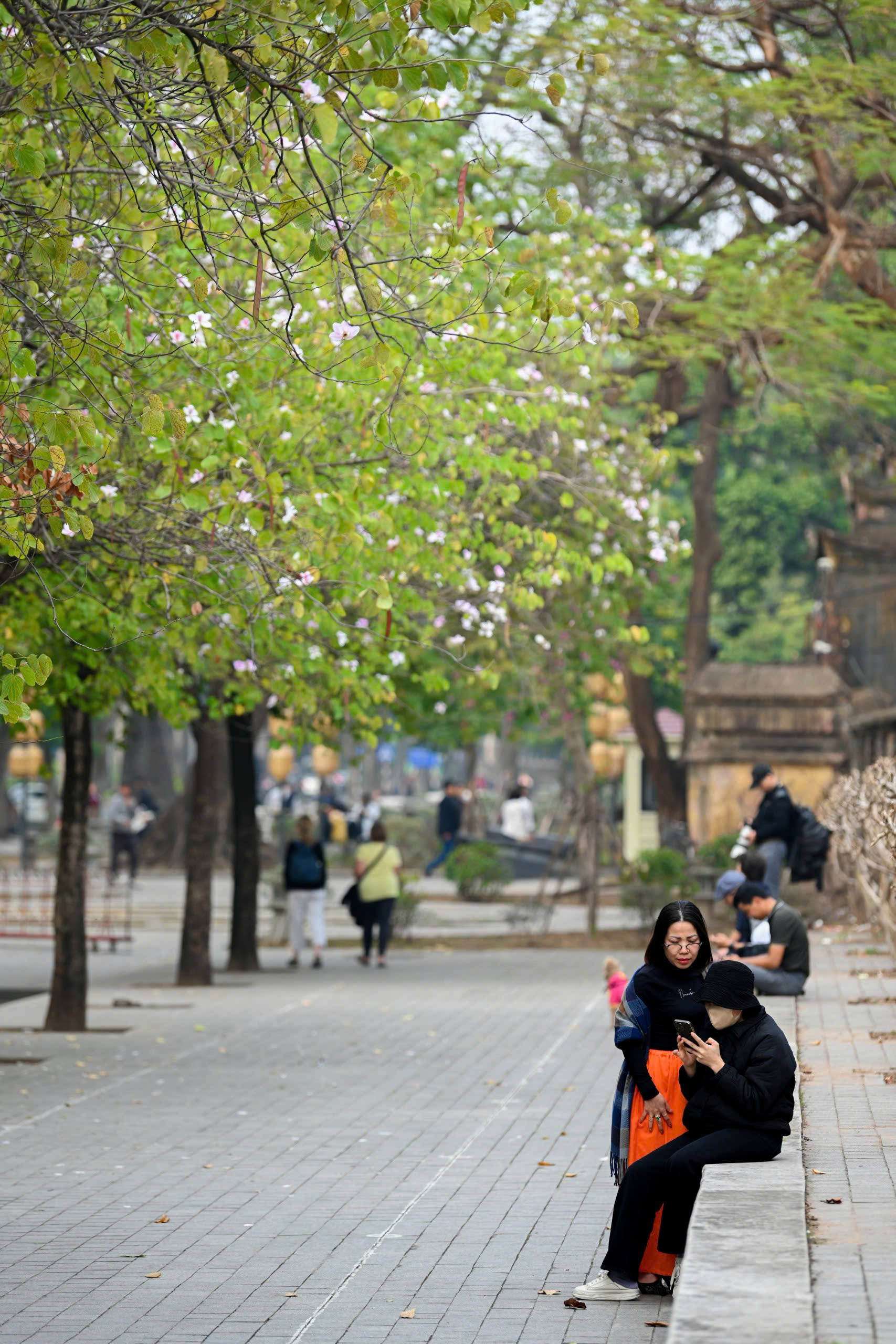 Nhiều người dân Thủ đô tìm đến những con phố rợp sắc hoa ban để ghi lại những khoảnh khắc đẹp và tận hưởng không gian thơ mộng.
