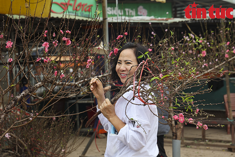 Tại cổng chợ hoa Quảng An, các tiểu thương đã bày bán đào Nhật Tân phục vụ cho người dân mua về chơi.