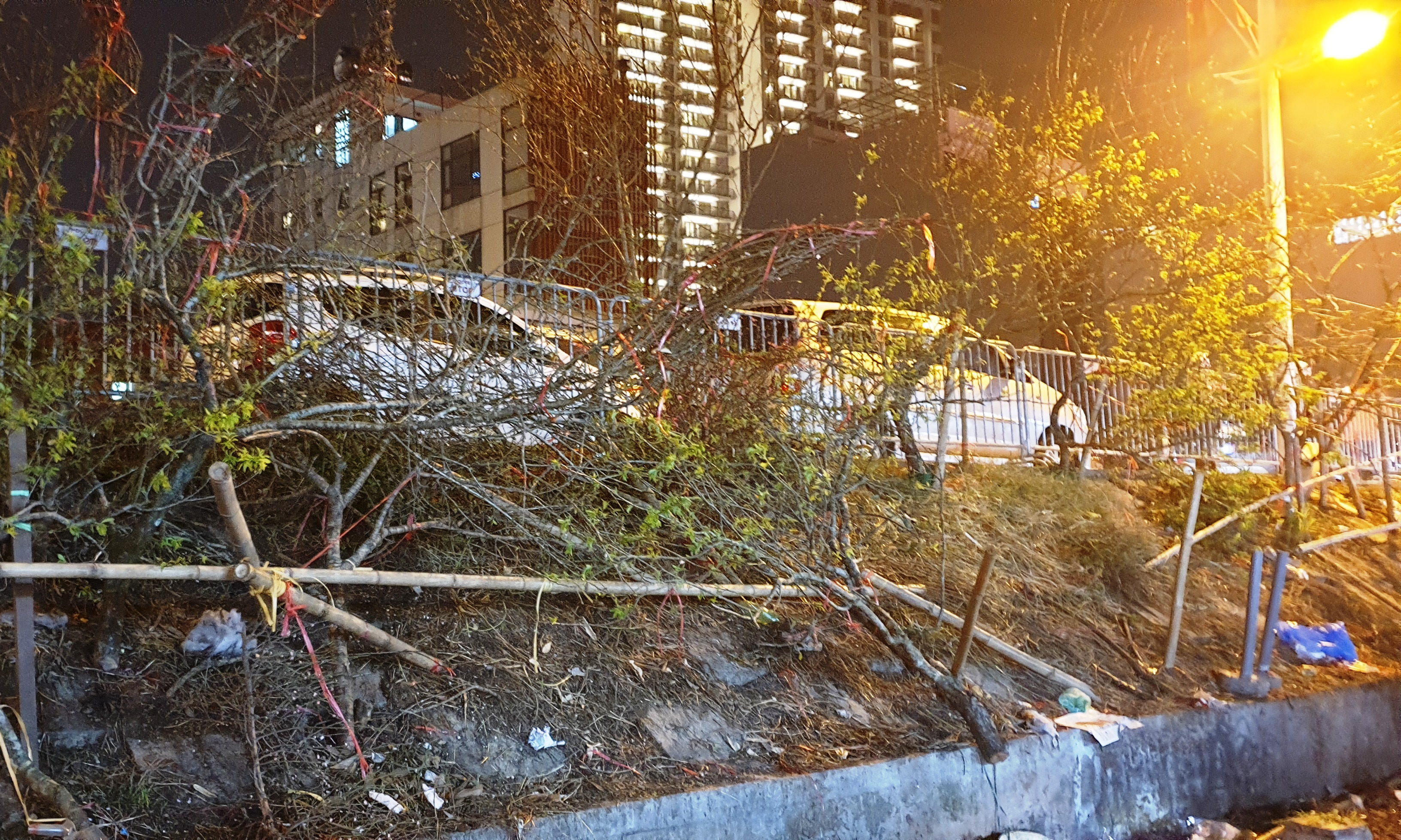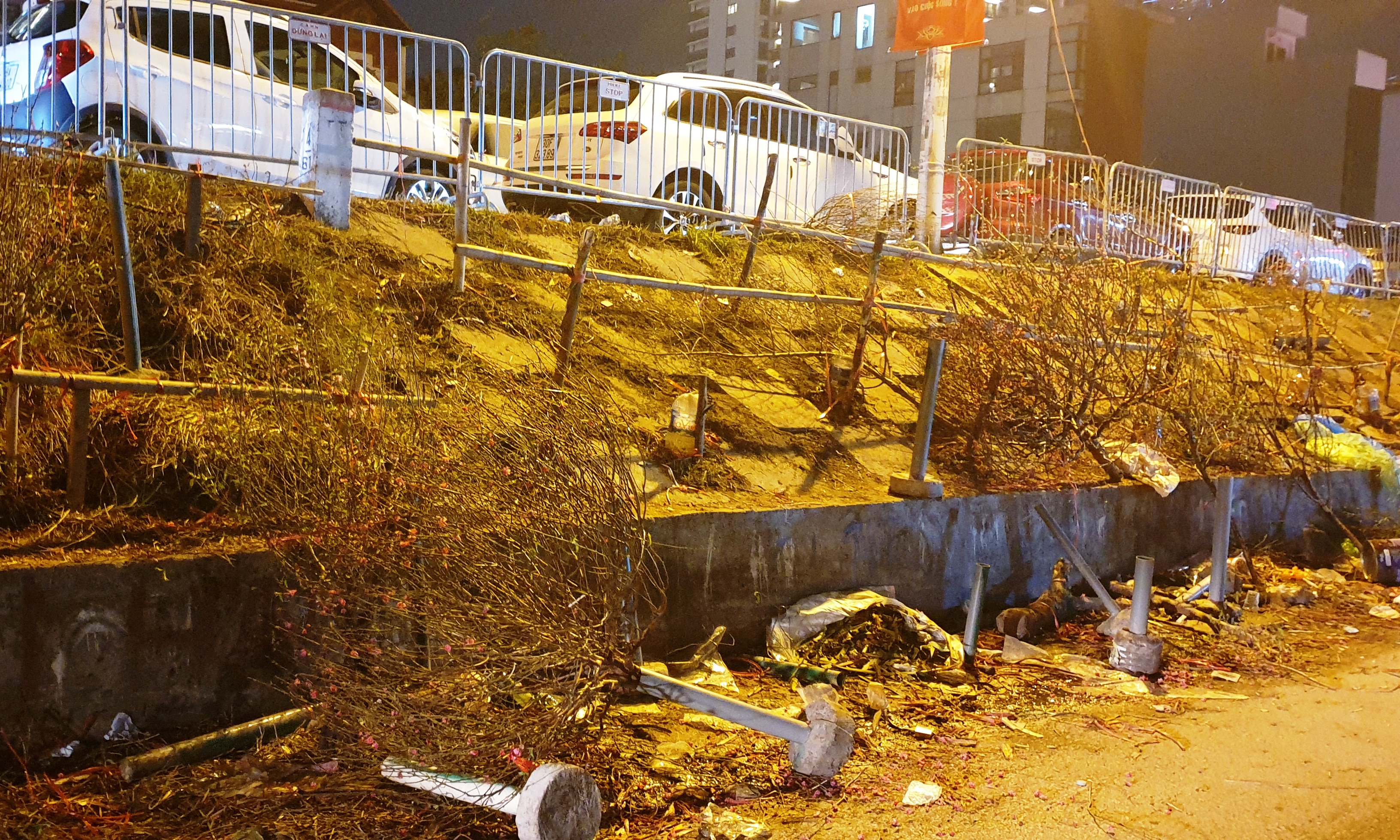 Đào cành nằm ngổn ngang chờ người dọn rác.