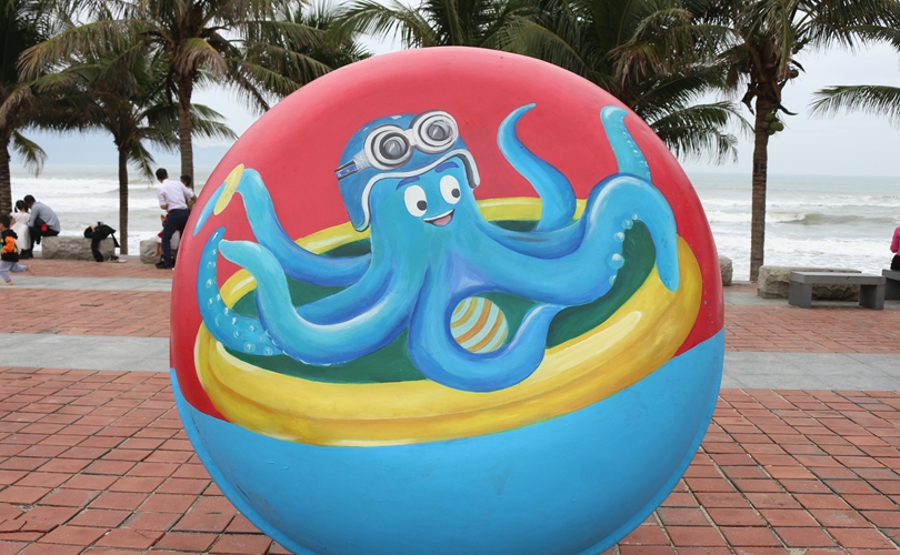 Chú bạch tuộc dễ thương đưa đưa lên thuyền thúng. (Ảnh:LT)