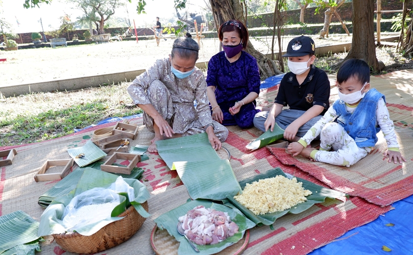 Người dân và du khách đến đây được hướng dẫn tham gia các hoạt động trải nghiệm như gói bánh chưng. (ảnh: BT)