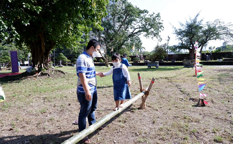 Trẻ em trải nghiệm trò chơi đi cầu thăng bằng tại phiên chợ. (ảnh: BT)