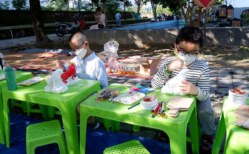 Nhiều hoạt động khám phá, trải nghiệm tự tay làm những sản phẩm truyền thống đã thu hút các bạn trẻ hào hứng tham gia cùng viết thư pháp, tô tượng, gói bánh chưng, bánh tét, têm trầu, làm lồng đèn trang trí Tết… (ảnh: BT)
