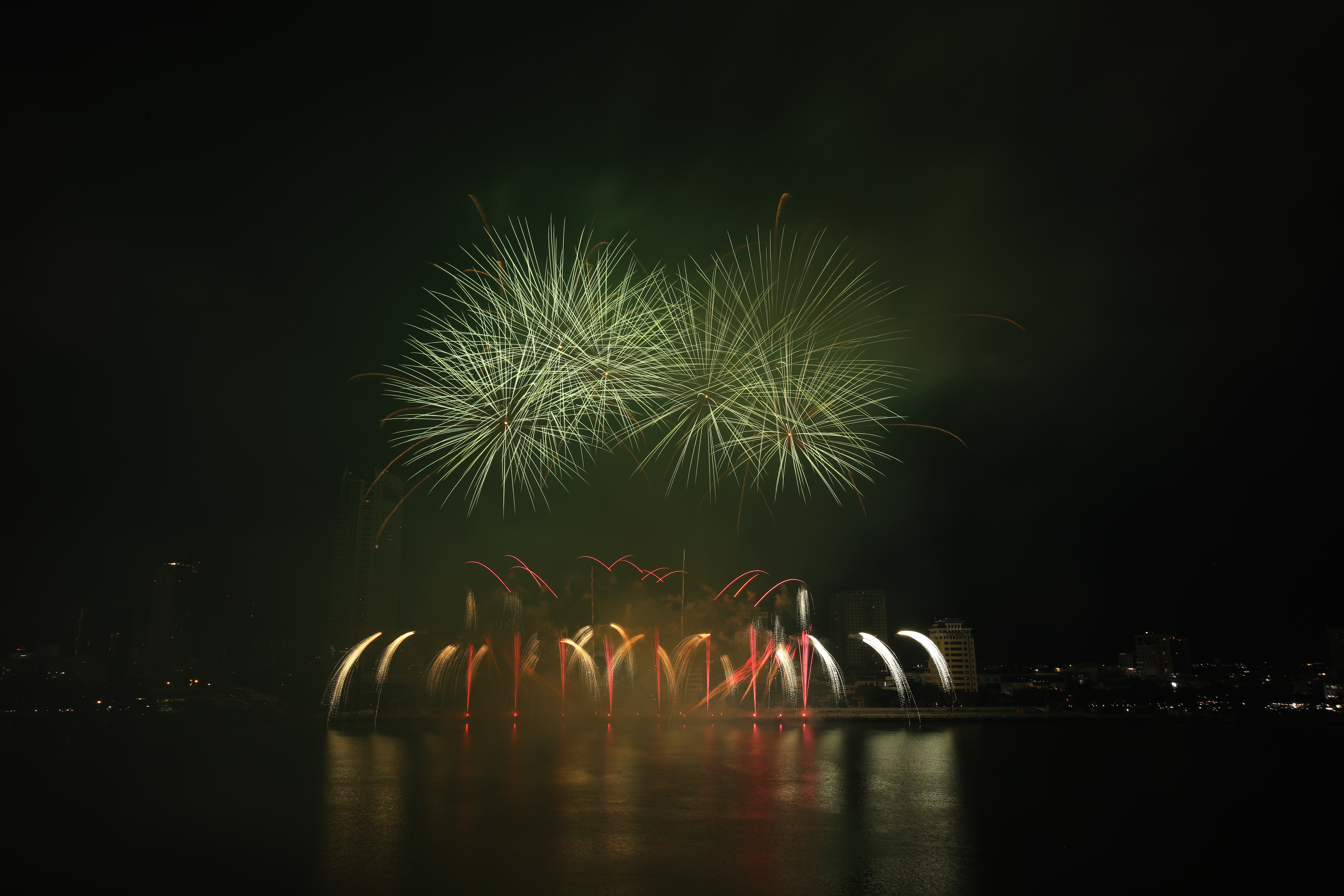 Tại đêm thứ 3 của DIFF 2024, đội pháo hoa đến từ Đức đã sử dụng 4.000 quả pháo để tạo ra những chùm pháo với tạo hình độc đáo ấn tượng như những cành liễu rủ, những tia lửa trôi xuống như sao rơi…