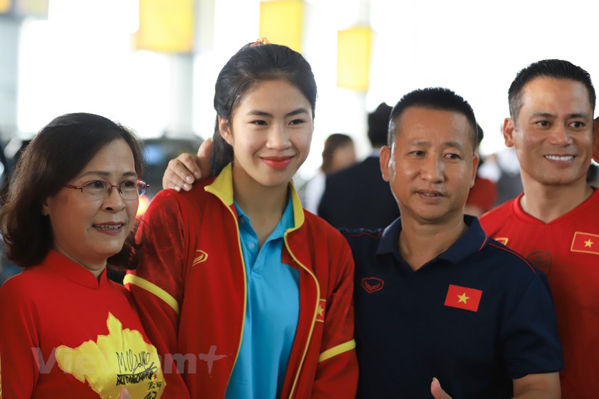 Tiền vệ Thanh Nhã được chào đón trong vòng tay của các cổ động viên. Cầu thủ sinh năm 2001 được đánh giá là một trong những tài năng triển vọng nhất của Bóng đá Nữ châu Á. (Ảnh: Việt Anh/Vietnam+)