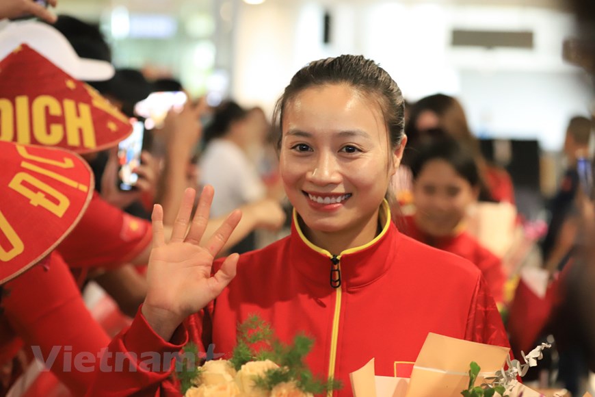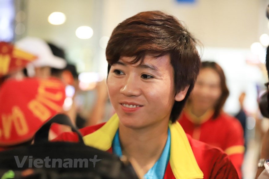 'Cô vợ quốc dân' Hoàng Thị Loan rạng ngời sau khi cùng Đội tuyển kết thúc hành trình lịch sử trên đất New Zealand. (Ảnh: Việt Anh/Vietnam+)