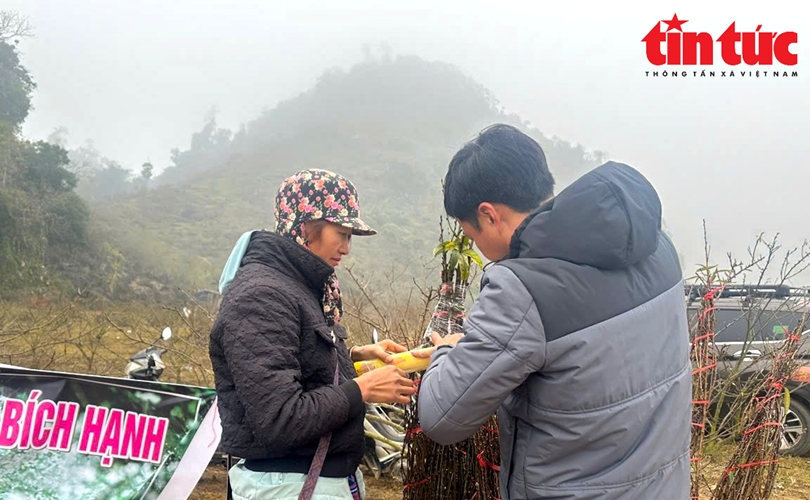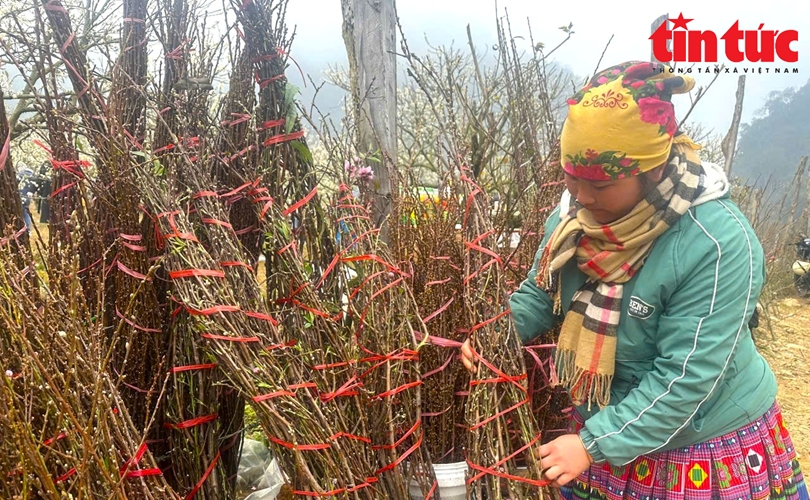 Ba năm nay, chị Giàng Thị Sáng (người bán hàng tại thung lũng mận Nà) tranh thủ những ngày cận kề Tết Nguyên đán, bán những cành đào, mận để kiếm thêm thu nhập.