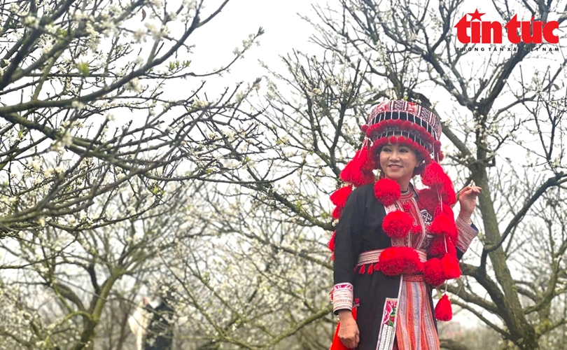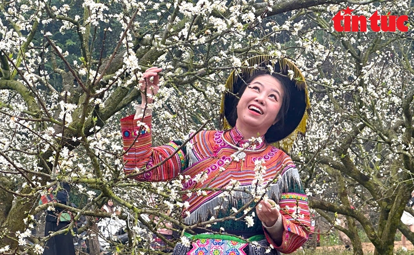 Du khách rạng rỡ check in dưới những cây mận hoa trắng muốt.