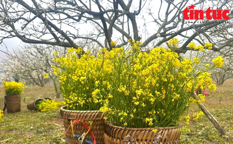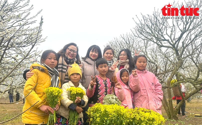 Những vị khách miền xuôi thích thú hòa mình vào không gian ngập tràn sắc trắng, sắc vàng của hoa mận, hoa cải.