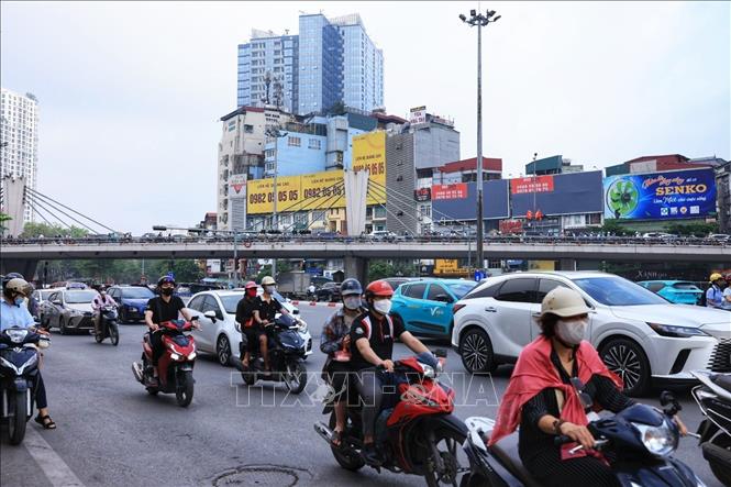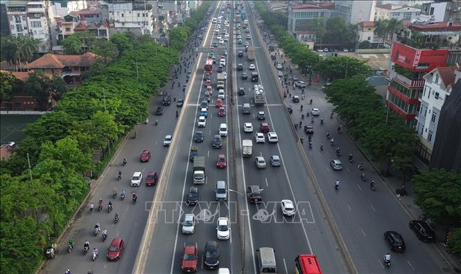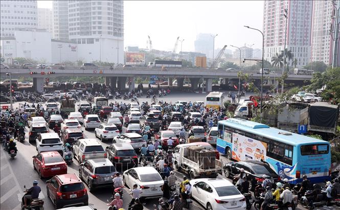 Ngã Tư Vọng xuất hiện tình trạng ùn ứ cục bộ do lượng phương tiện tăng cao (ảnh chụp lúc 7h20 phút). Ảnh: Tuấn Anh/TTXVN