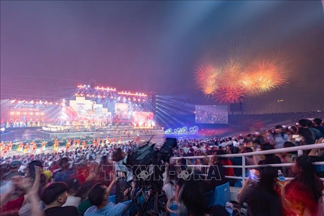 Màn pháo hoa chào mừng tại khu vực đường đua F1 (phường Phú Đô, quận Nam Từ Liêm), rực sáng bầu trời Sân vận động quốc gia Mỹ Đình - nơi diễn ra Chương trình chính luận nghệ thuật “Hẹn ước Bắc - Nam”. Ảnh: Minh Quyết/TTXVN