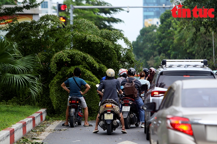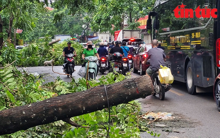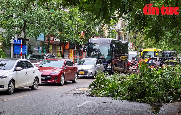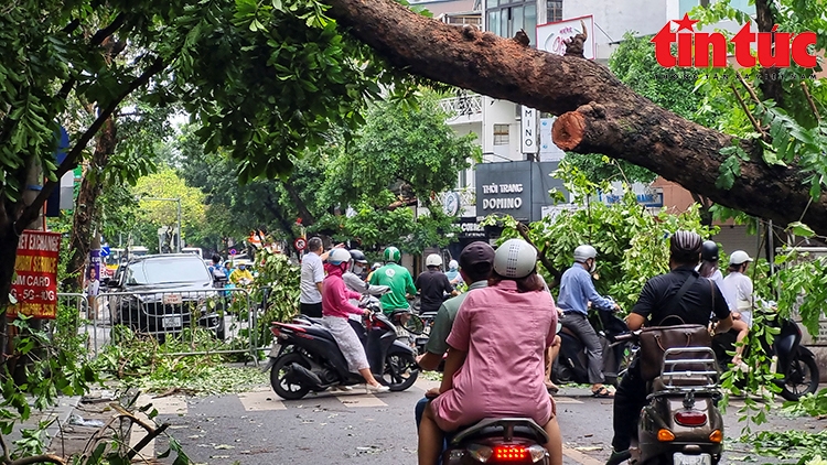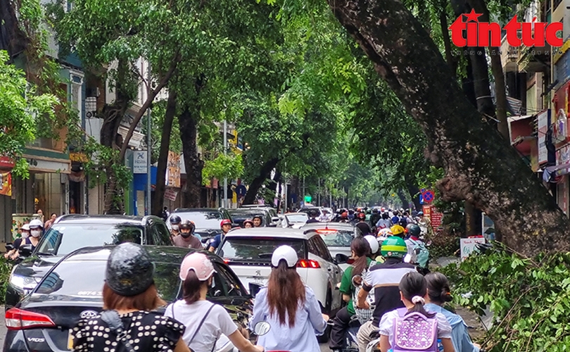 Tương tự, ngã tư Hàng Bài - Trần Hưng Đạo cây cổ thụ đổ chiếm nửa đường, các phương tiện di chuyển chậm qua đây.