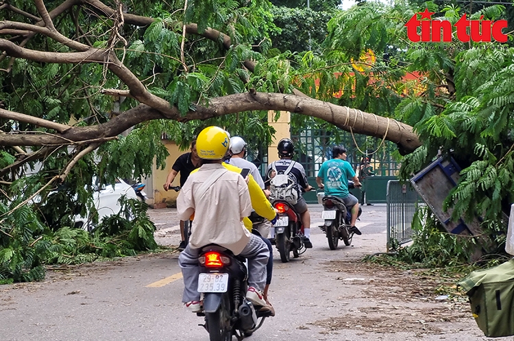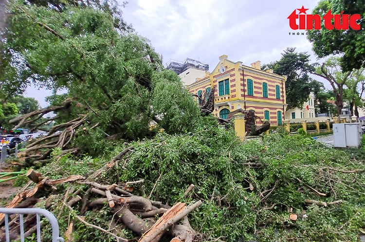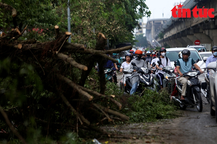 Trên phố Lò Đúc, số lượng cây đổ khá nhiều tuy đã được thu dọn nhưng vẫn ảnh hưởng đến giao thông.