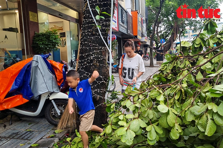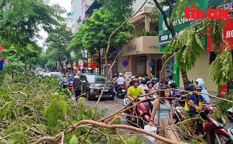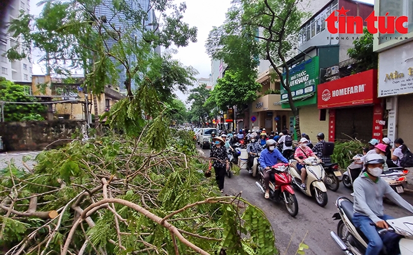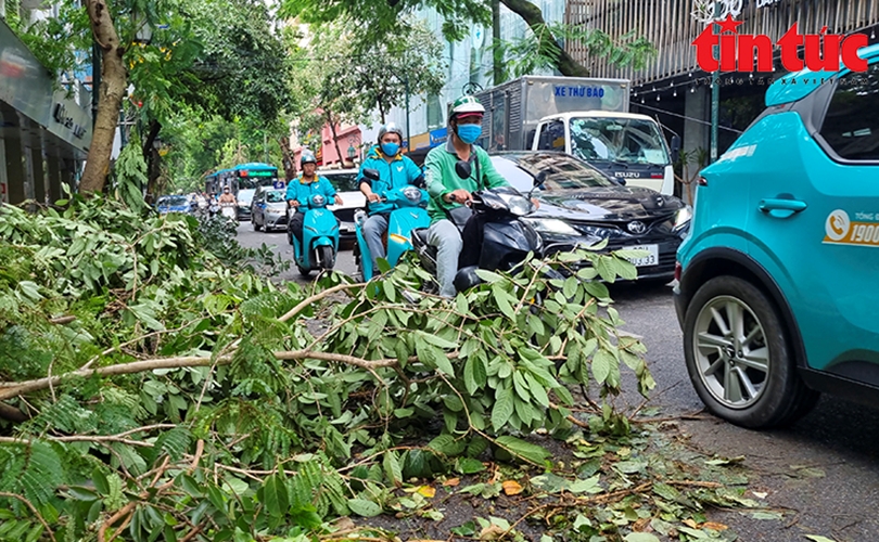 Trên phố Tràng Thi, nhiều cành cây tràn xuống lòng đường.