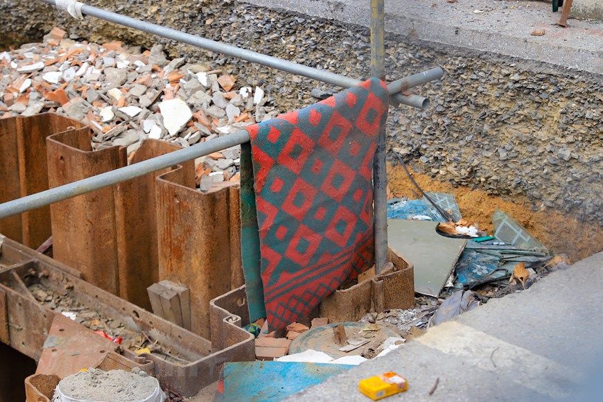 Trên đoạn đường Vũ Trọng Khánh (Hà Nội) vẫn đang tồn tại nhiều vị trí rào chắn phục vụ thi công dự án hệ thống xử lý nước thải Yên Xá. Tuy nhiên, thực tế không có máy móc, lực lượng thi công.