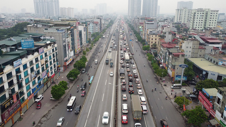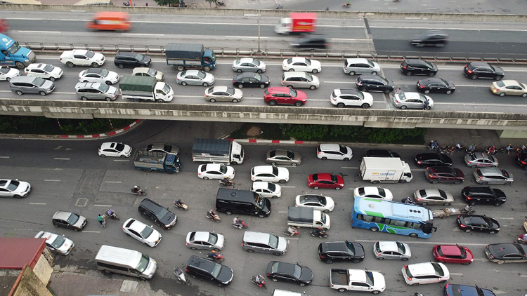 Lưu lượng phương tiện dồn về đường Vành đai 3 trên cao (đoạn từ Mai Dịch đến qua hồ Linh Đàm) tăng cao.