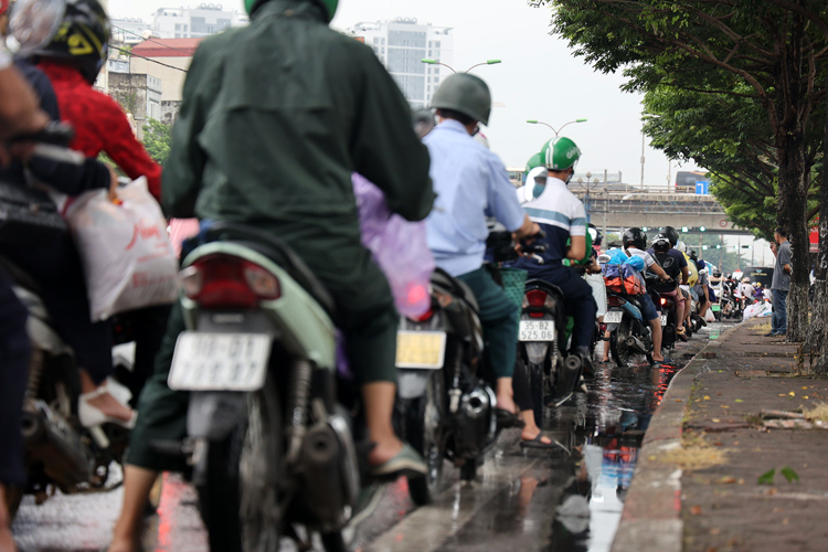 Nhiều xe máy cố gắng vượt qua đoạn đường ùn tắc.