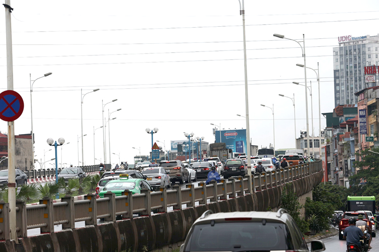 Trên cầu Vĩnh Tuy, lượng người đi ra khỏi nội thành tăng cao khiến giao thông bị ùn tắc.