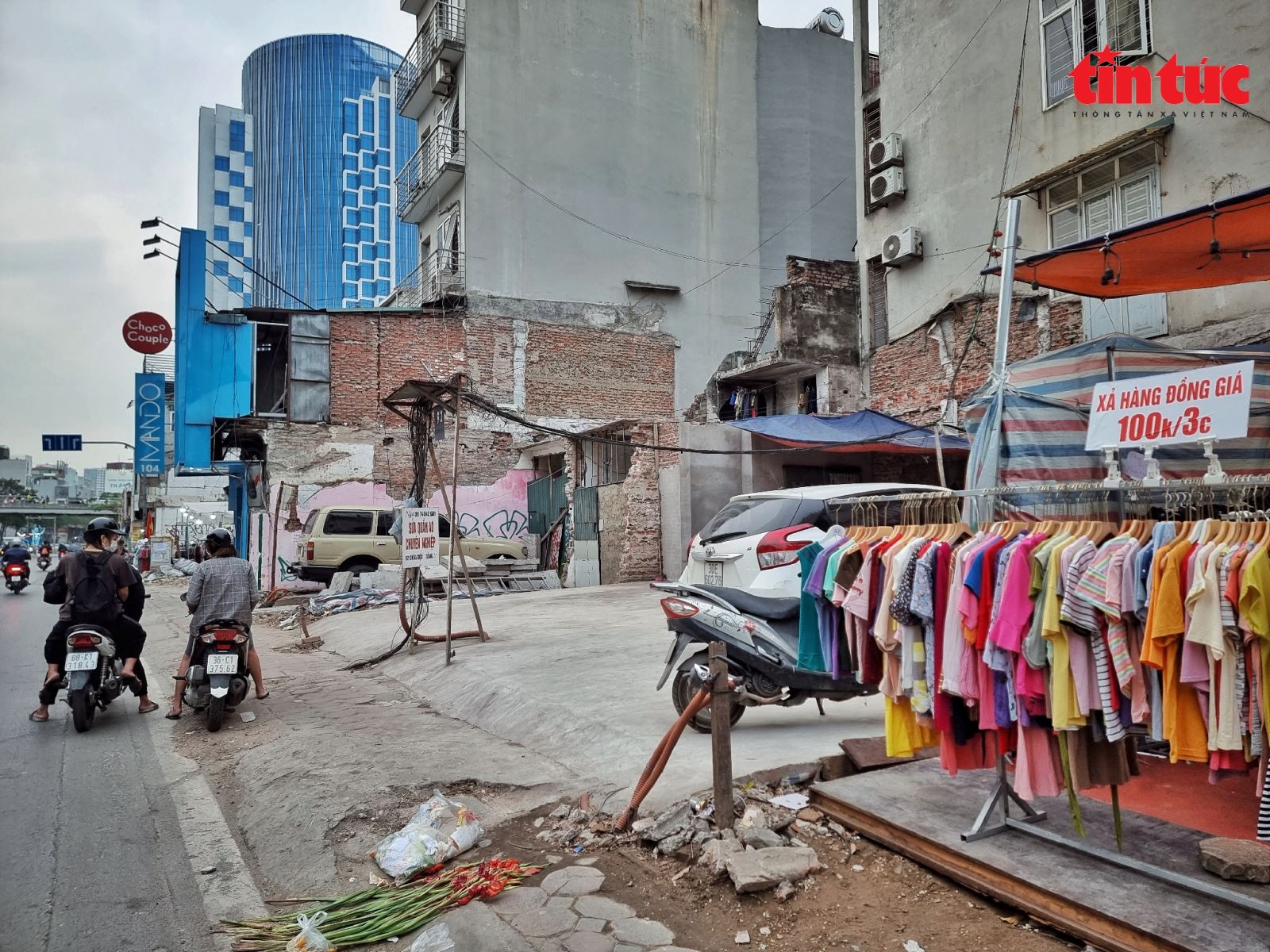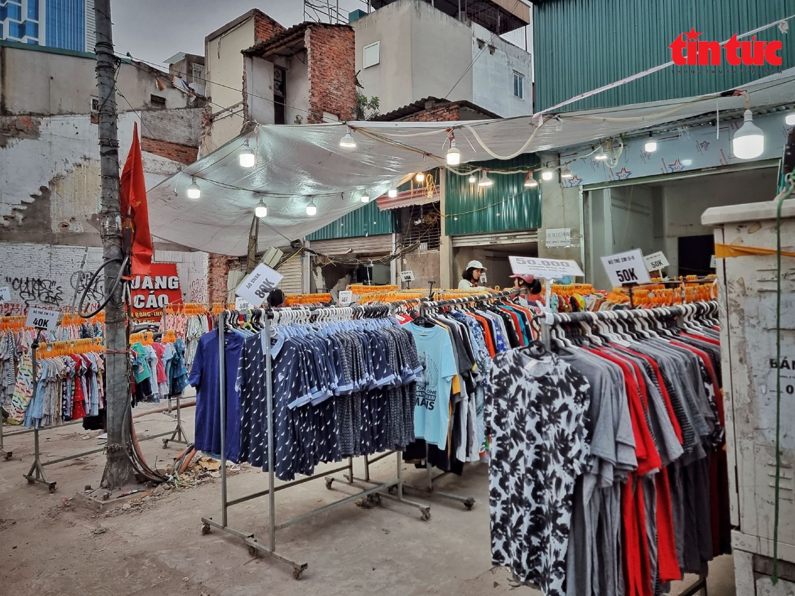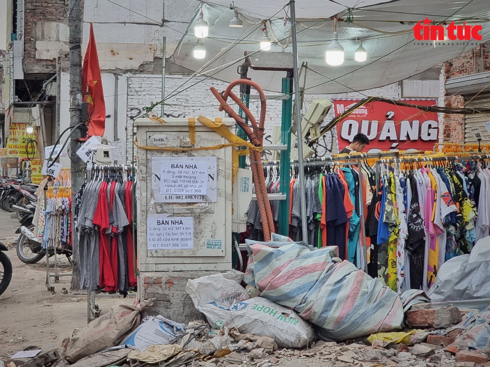 Quần áo được bày bán bên cạnh đống rác thải vật liệu xây dựng từ quá trình phá dỡ nhà.