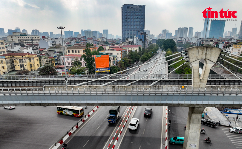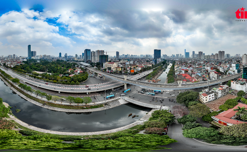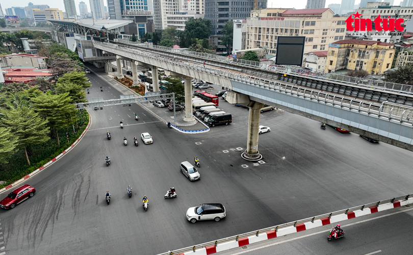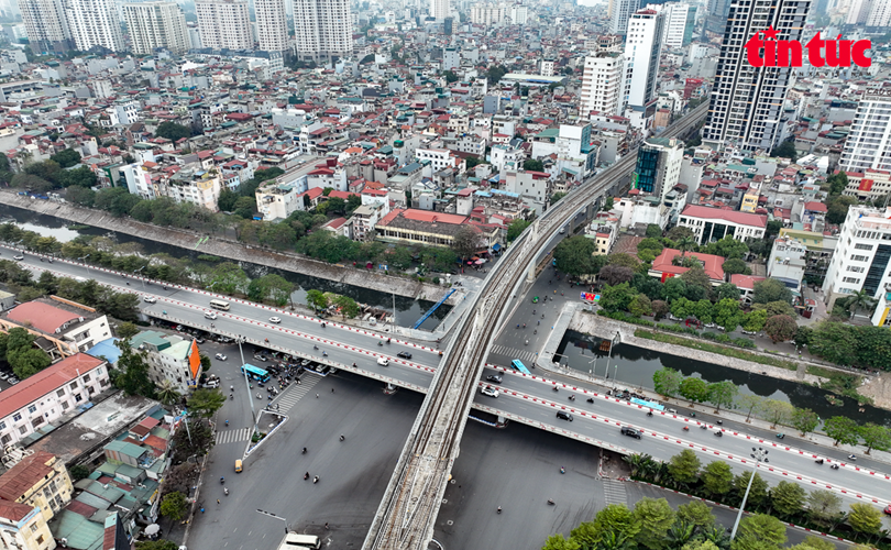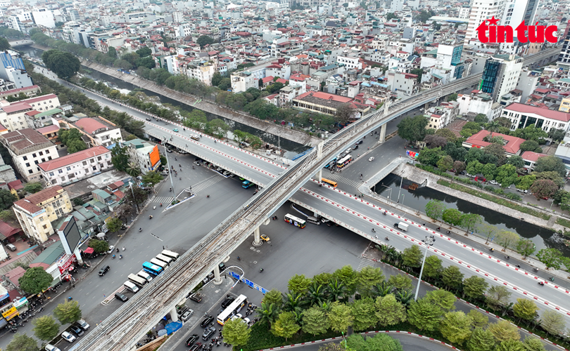 Hiện nút giao thông Cầu Giấy là nút giao 3 tầng, phía trên cùng là dự án đường sắt đô thị Metro Nhổn-ga Hà Nội đang gấp rút triển khai.