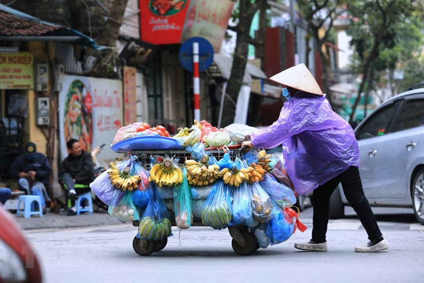 Những người lao động ngoài trời mặc cả áo mưa dù trời không mưa để tránh gió rét.