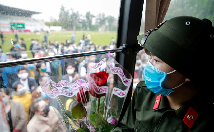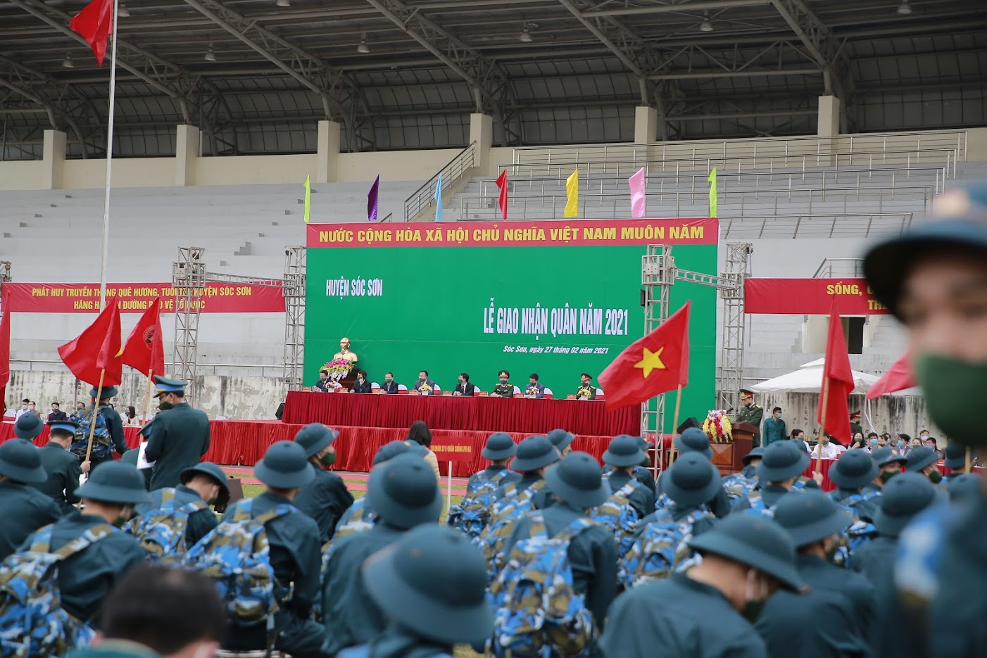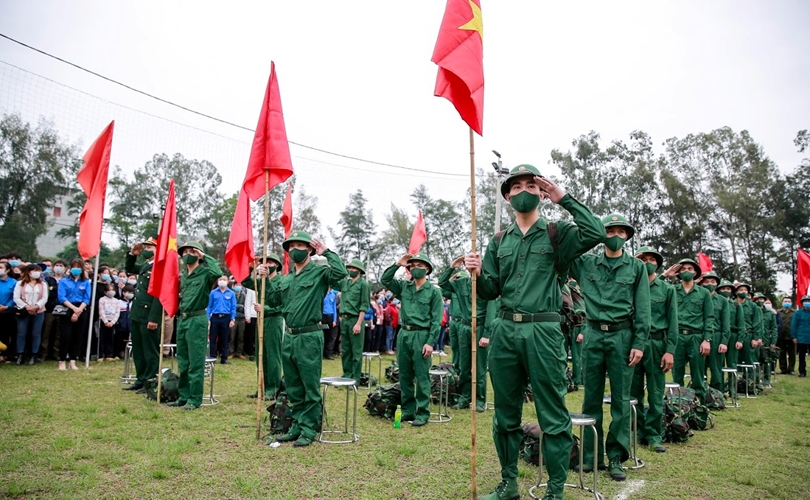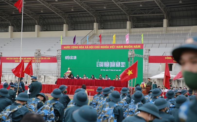 Quang cảnh lễ giao nhận quân năm 2021 tại huyện Sóc Sơn, thành phố Hà Nội.