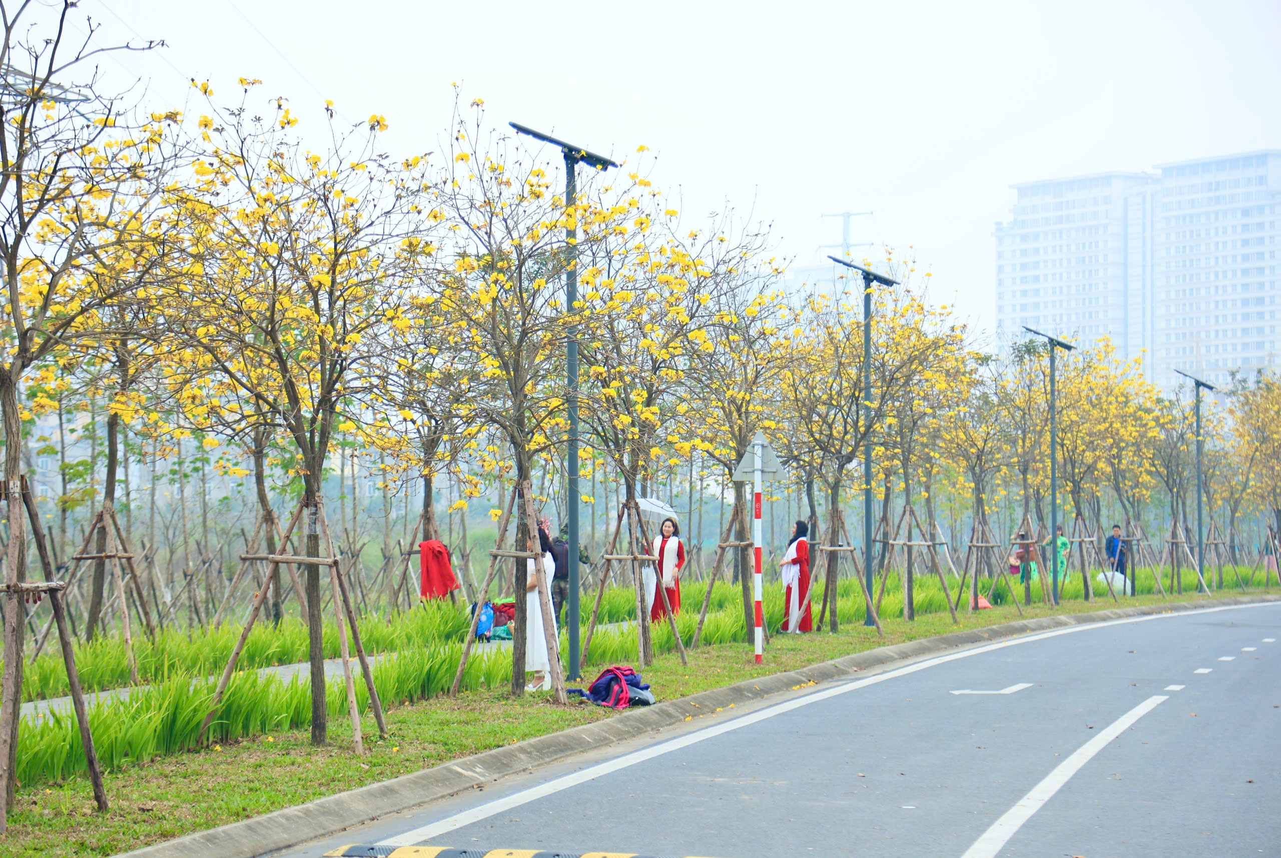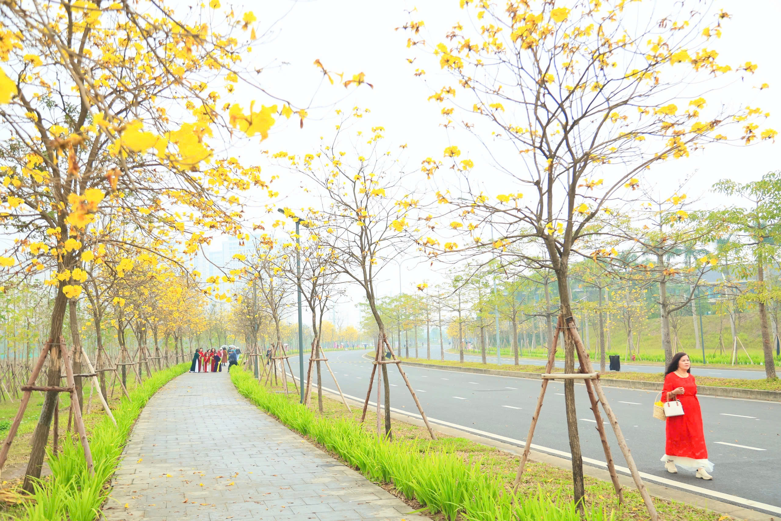 Những ngày đầu xuân, hai bên đường trong khu đô thị ở Hà Đông, Hà Nội rực rỡ sắc vàng của hoa phong linh, khiến nhiều người ghé thăm có cảm giác như lạc vào mùa thu vàng lãng mạn của Hàn Quốc.