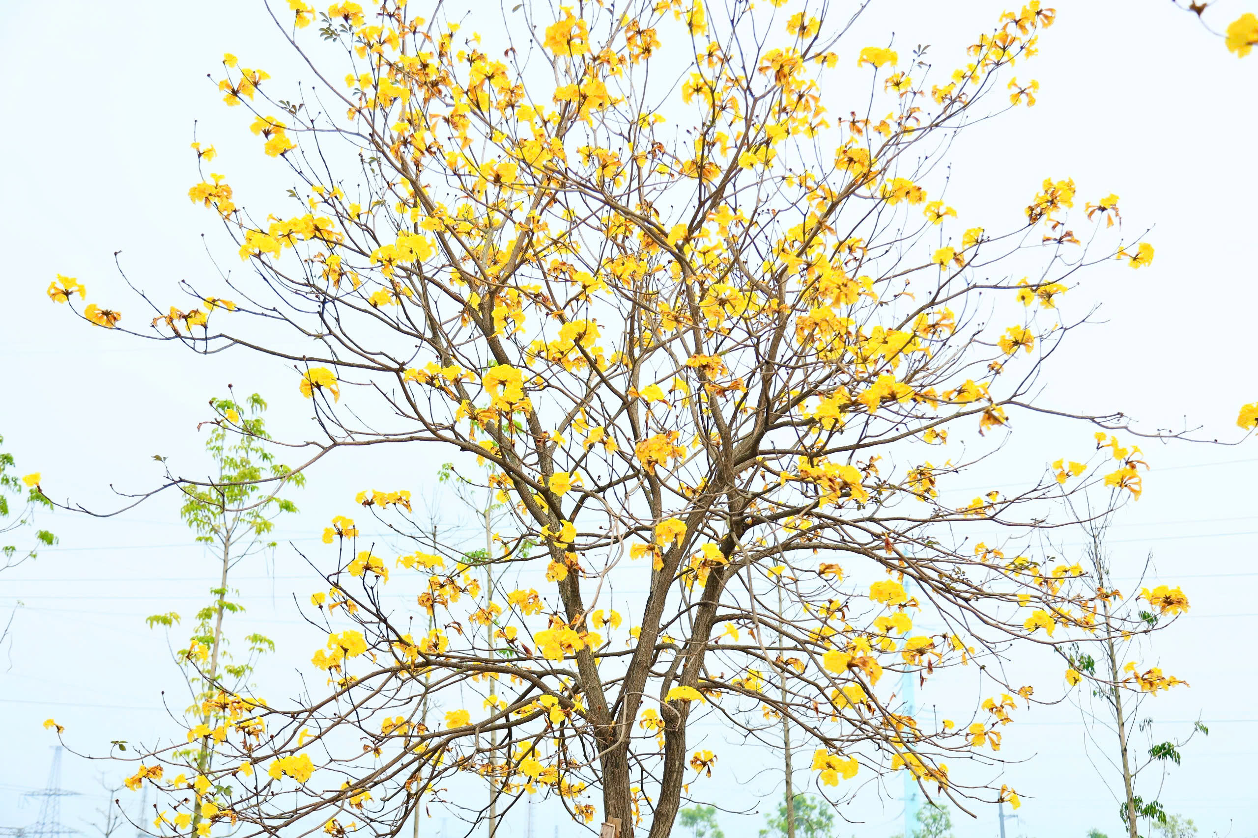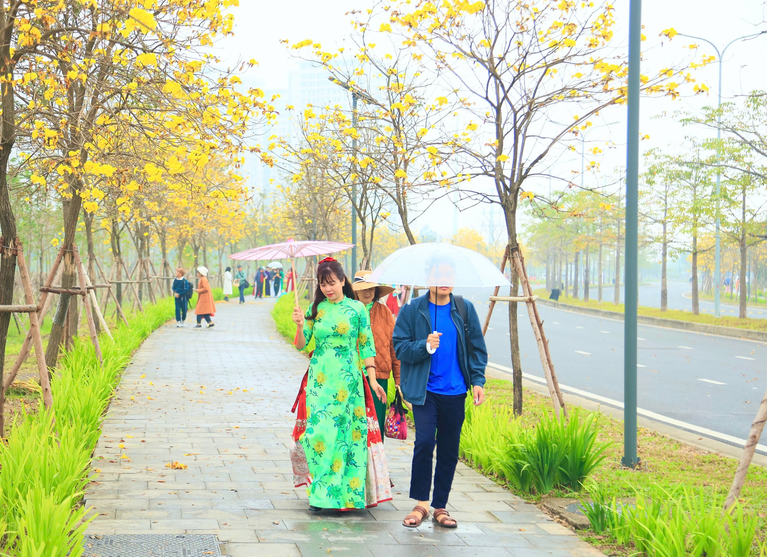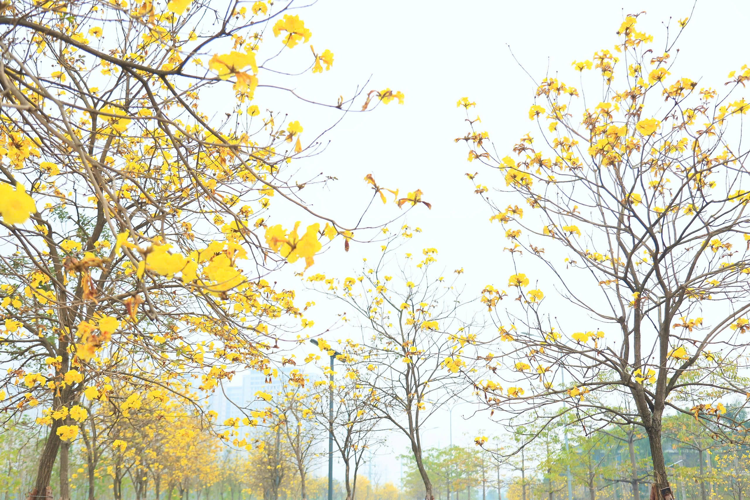Tại một khu đô thị ở quận Hà Đông (Hà Nội), hàng trăm cây hoa phong linh đang nở rộ, tỏa sắc vàng rực rỡ giữa tiết trời mùa xuân. Vẻ đẹp rực rỡ của loài hoa này đã thu hút nhiều "nàng thơ" đến check-in và chụp ảnh.