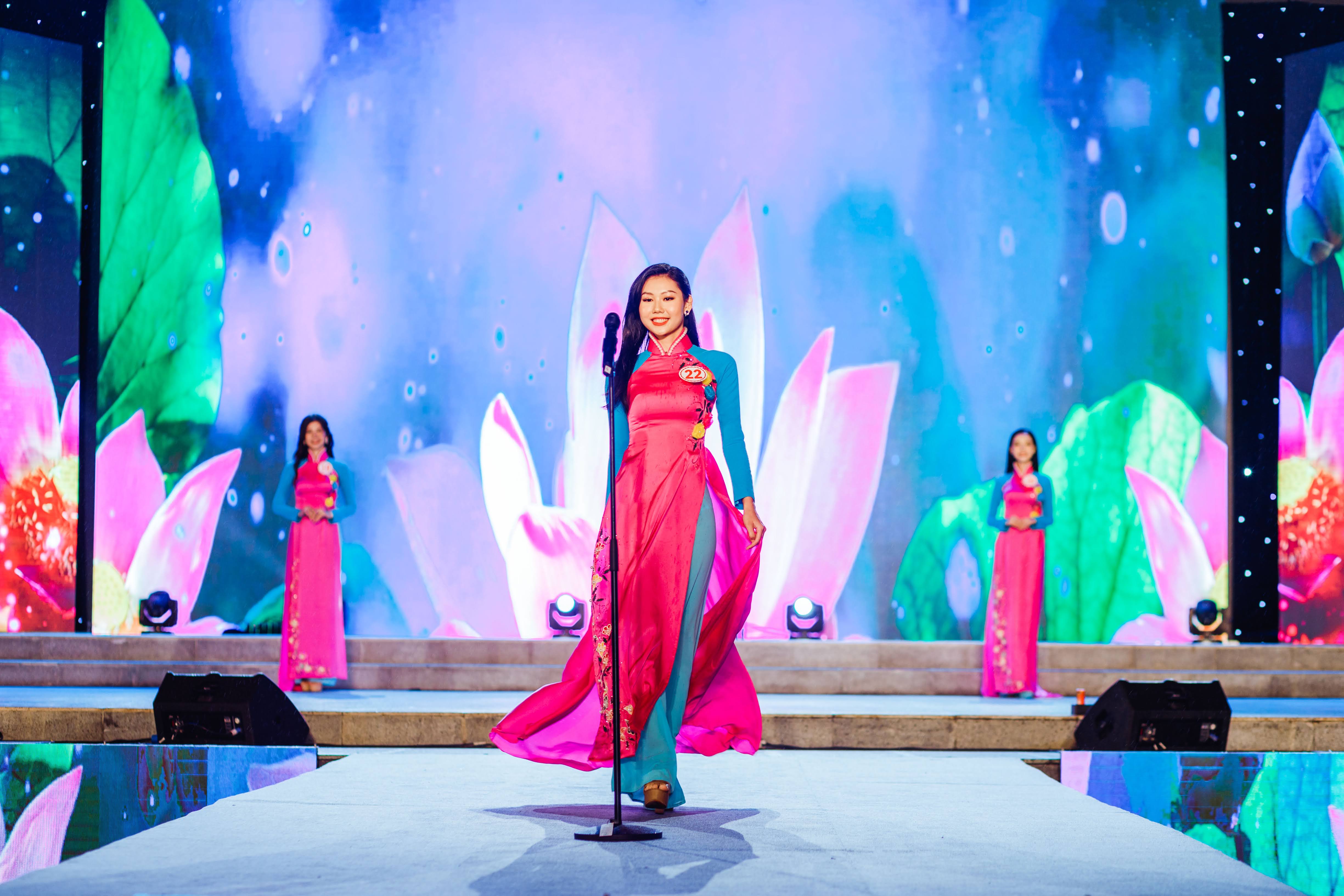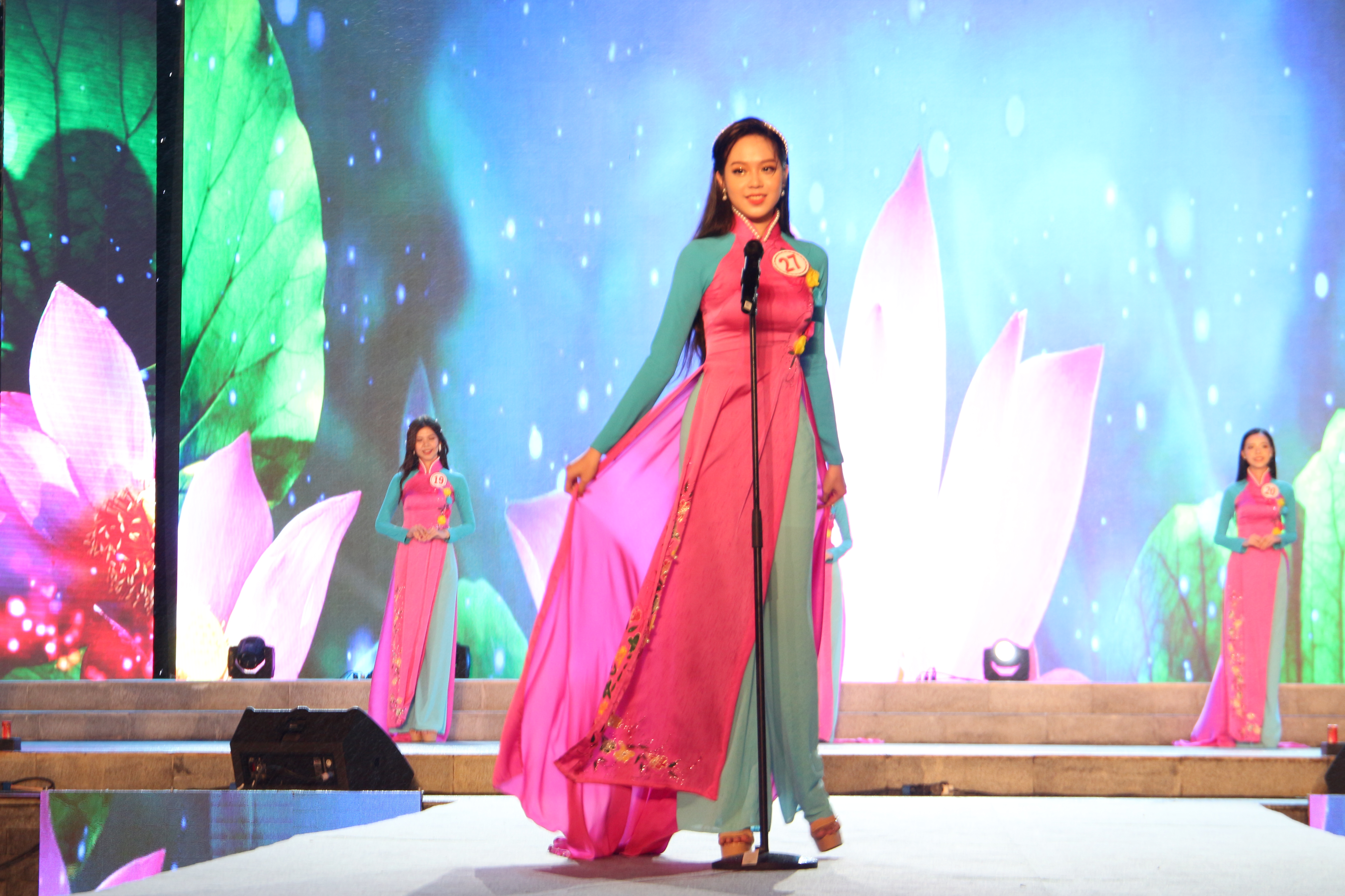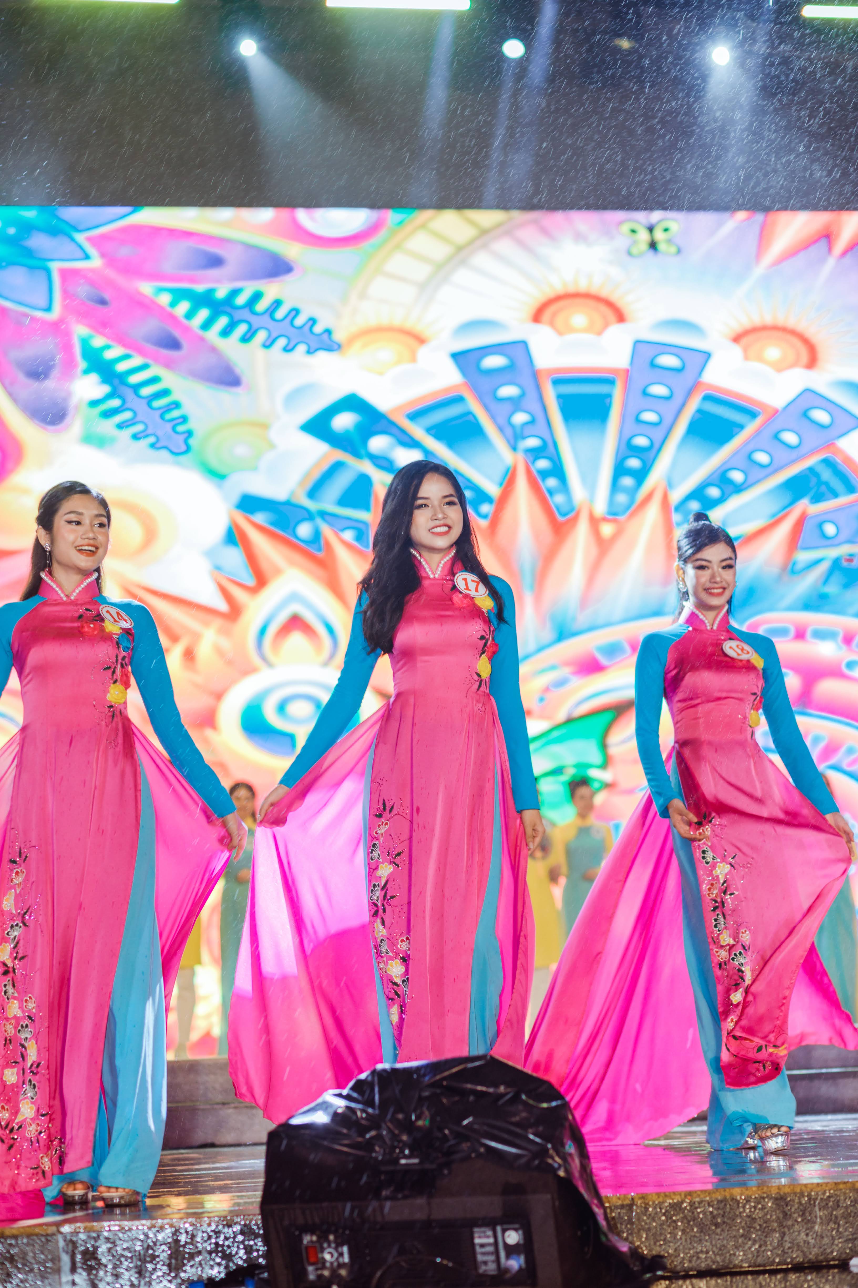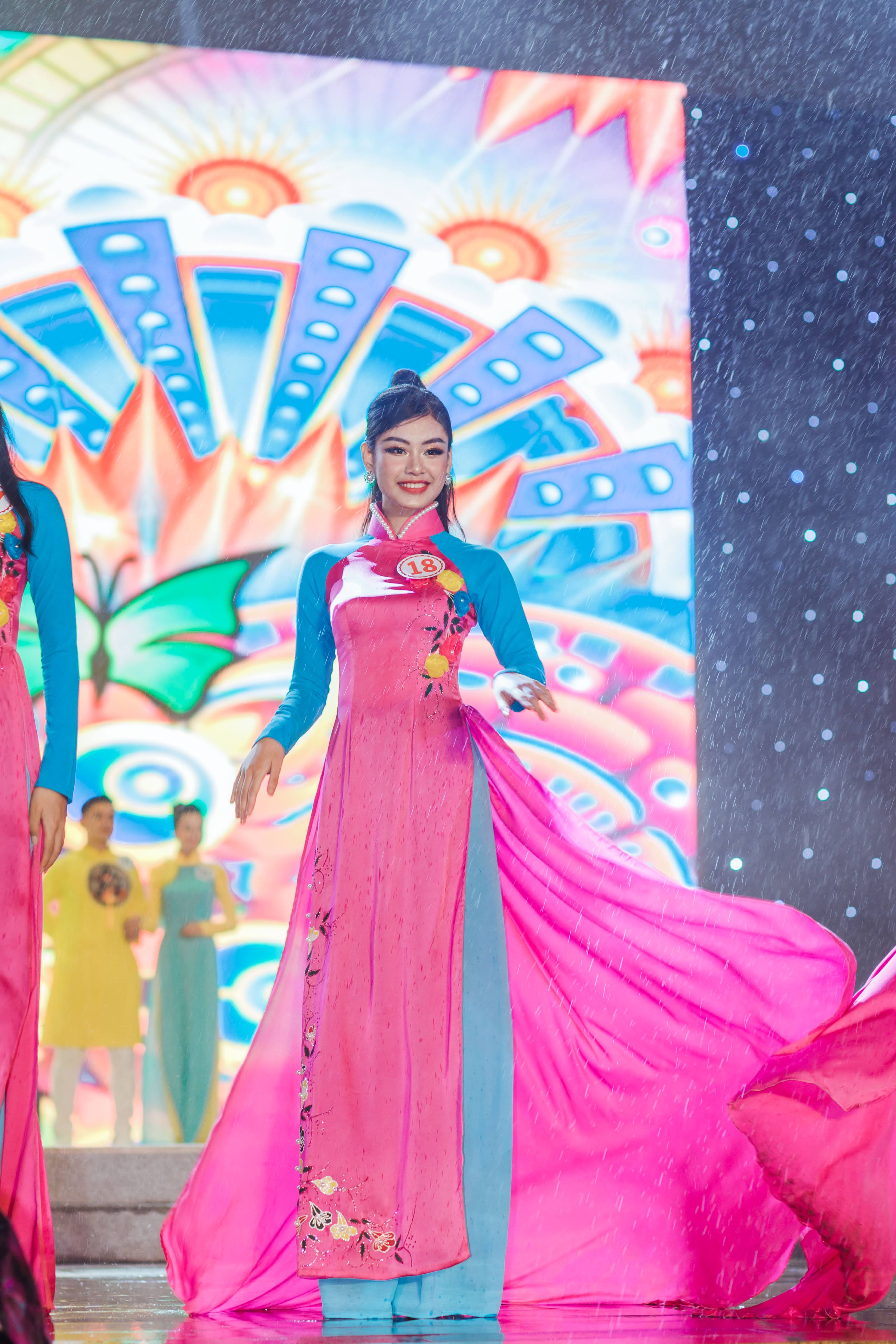 Trong đêm chung kết, các thí sinh lần lượt trình diễn trang phục áo dài.