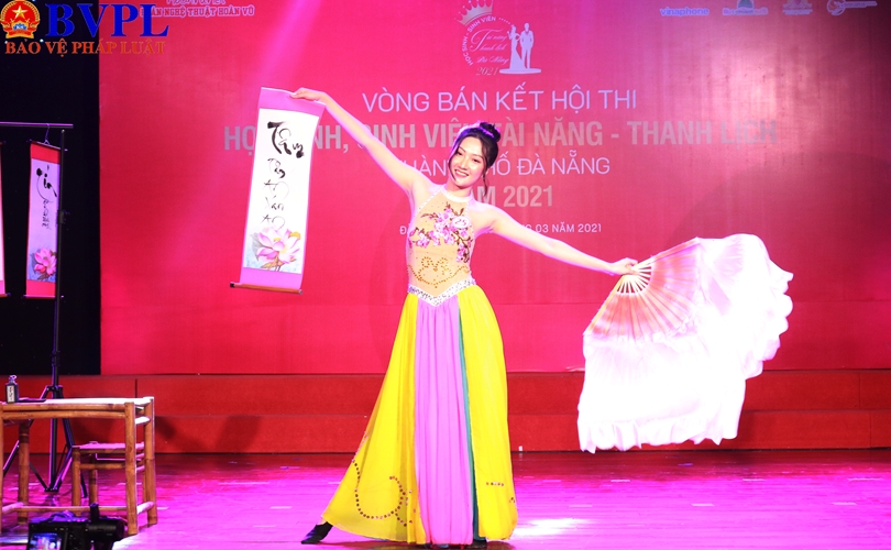 Thí sinh Nguyễn Trương Thiên Ngọc (Viện Nghiên cứu và Đào tạo Việt Anh, ĐH Đà Nẵng) biểu diễn múa truyền thống kết hợp viết thư pháp.
