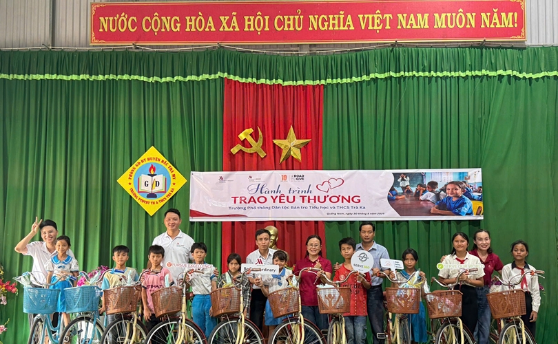Đại diện tập đoàn Marriott International trao tặng xe đạp cho học sinh trường phổ thông dân tộc Bán trú Tiểu học và THCS Trà Ka.
