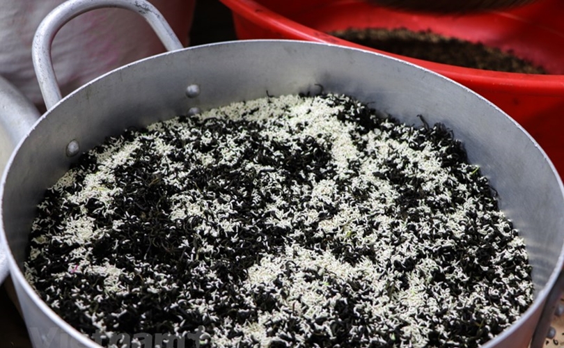 Để có được những túi trà sen thơm ngát phải trải qua nhiều công đoạn cầu kì, công phu, mất rất nhiều thời gian, công sức. Với hương vị tinh tế, đậm đà, trà sen Tây Hồ trở thành món quà quen thuộc, thanh nhã nổi tiếng trên đất Hà Thành. Giá trà sen khoảng 7 triệu đồng/kg, còn những bông sen "ướp xổi" có giá 35.000-80.000 đồng/bông. (Ảnh: Hương Trà/Vietnam+)