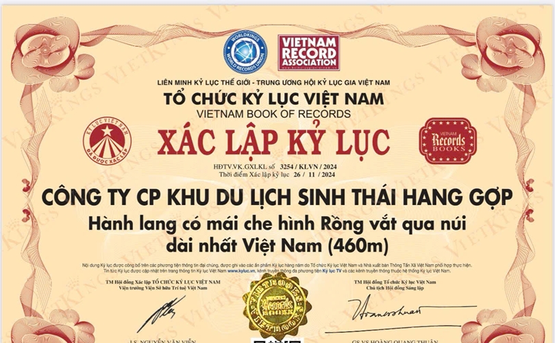 Tổ chức Kỷ lục Việt Nam trao chứng nhận kỷ lục hành lang có mái che hình rồng dài nhất Việt Nam cho Công ty CP Khu du lịch sinh thái Hang Gợp.