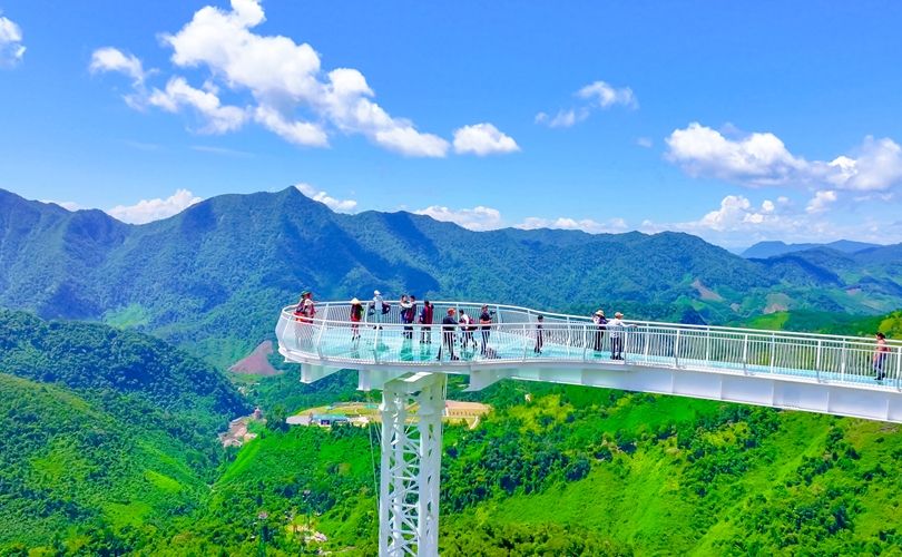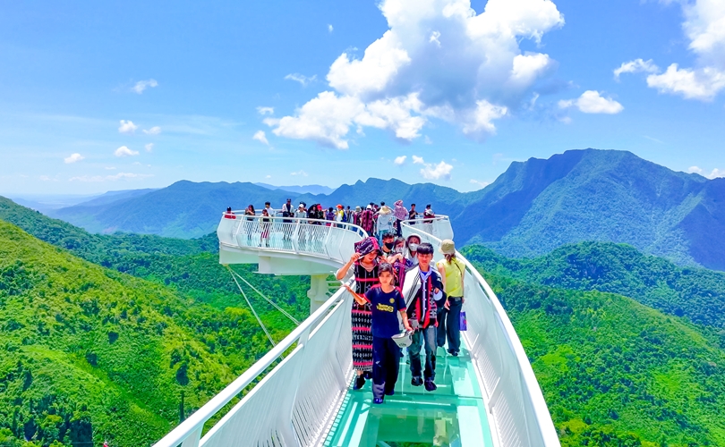 Du khách và người dân hứng thú trải nghiệm đứng trên cầu kính trong suốt ngắm nhìn cảnh vật núi rừng Đông Giang.