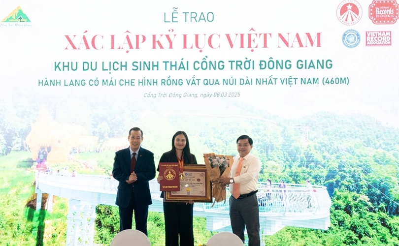 Tổ chức Kỷ lục Việt Nam vừa trao chứng nhận xác lập kỷ lục Hành lang có mái che hình rồng vắt qua núi dài nhất Việt Nam cho Công ty Cổ phần Khu du lịch sinh thái Hang Gợp - Chủ đầu tư Khu du lịch sinh thái Cổng trời Đông Giang.