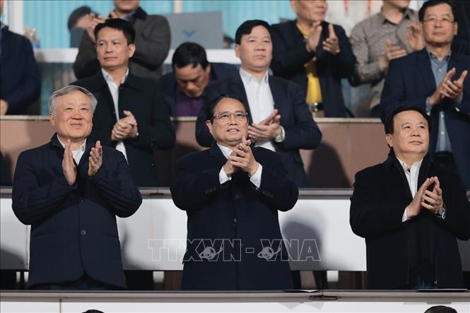 Thủ tướng Phạm Minh Chính, Phó Thủ tướng Thường trực Nguyễn Hòa Bình và Giám đốc Học viện CTQG Hồ Chí Minh Nguyễn Xuân Thắng đến sân Việt Trì cổ vũ đội tuyển trong trận chung kết lượt đi, tối 2/1.