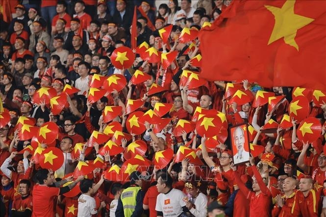 Cổ động viên Việt Nam trên sân Việt Trì “tiếp lửa” cho đội tuyển thi đấu trong trận chung kết lượt đi, tối 2/1
