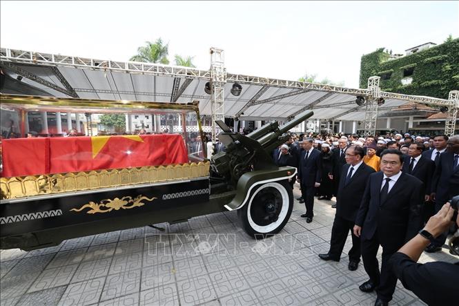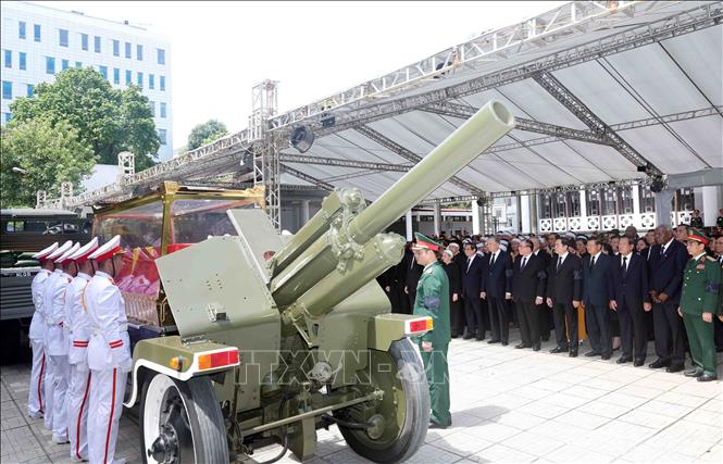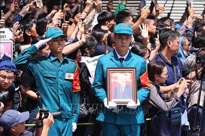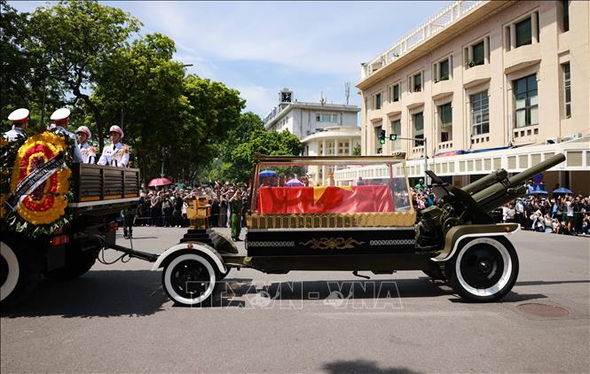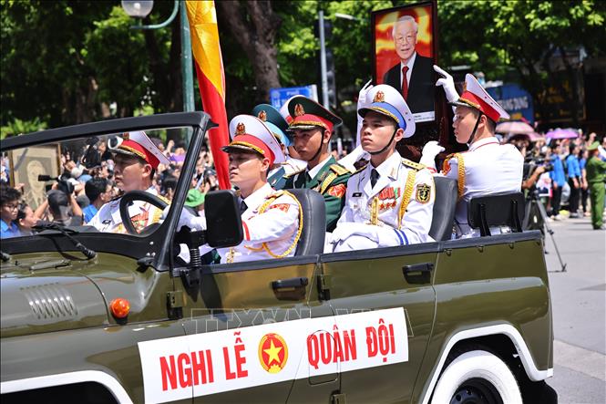 Chiều 26/7/2024, sau lễ truy điệu, đoàn xe nghi lễ đưa linh cữu Tổng Bí thư Nguyễn Phú Trọng từ Nhà tang lễ Quốc gia số 5 Trần Thánh Tông về Nghĩa trang Mai Dịch, thành phố Hà Nội.