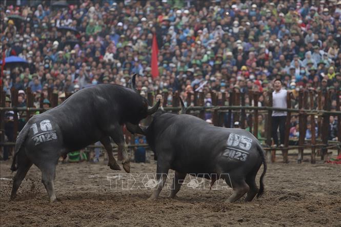 Trận thi đấu bán kết tại Lễ hội chọi trâu truyền thống xã Hải Lựu năm 2023.