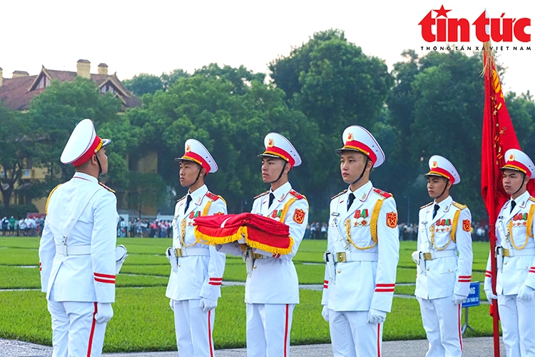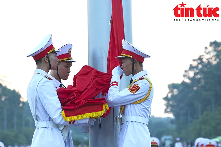 Trên nền quân nhạc, các chiến sĩ thuộc Đoàn 275 (Bộ Tư lệnh bảo vệ Lăng Chủ tịch Hồ Chí Minh) với lá cờ tổ quốc trên tay tiến ra Quảng trường Ba Đình để thực hiện nghi lễ Thượng cờ.