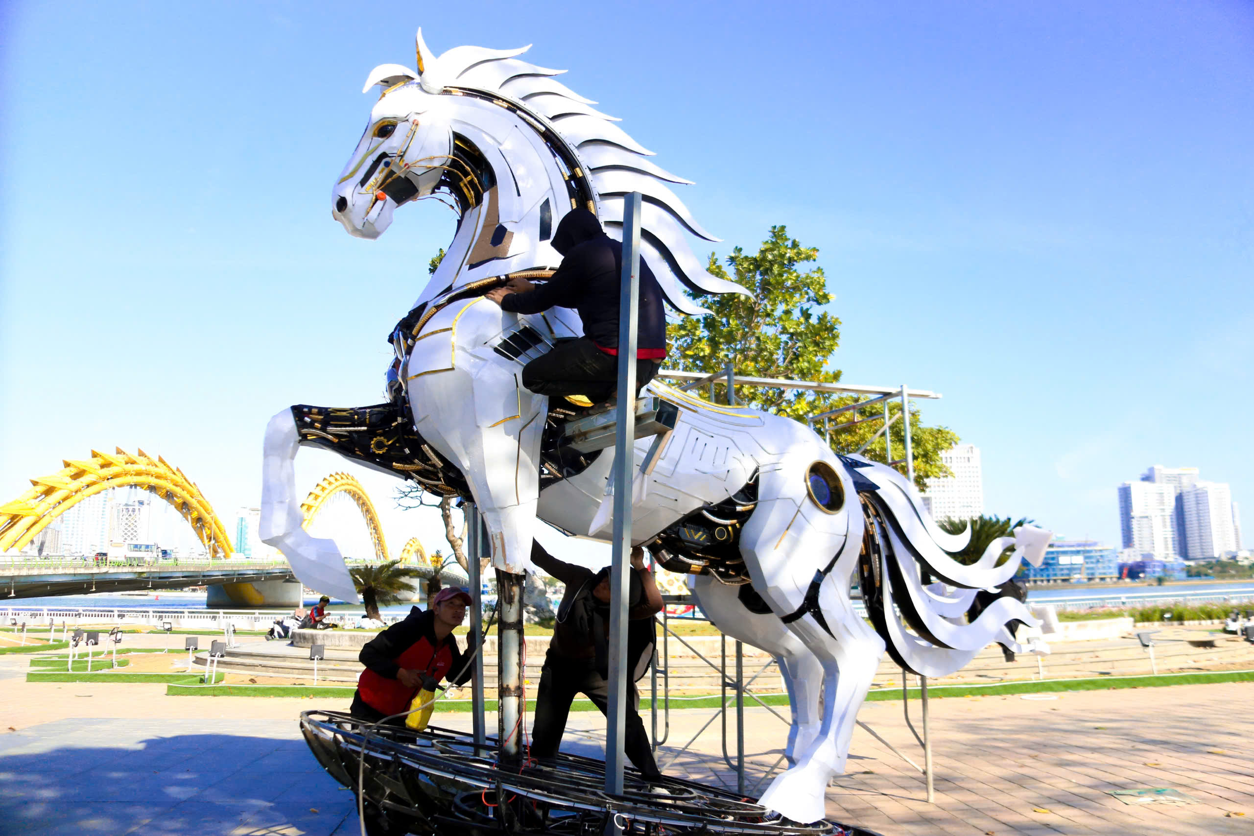 Anh Tấn Hiệp, đại diện đơn vị thi công, cho biết để hoàn thiện linh vật ngựa, đơn vị đã mất hơn 3 tháng thi công trước khi vận chuyển vào Đà Nẵng lắp đặt.