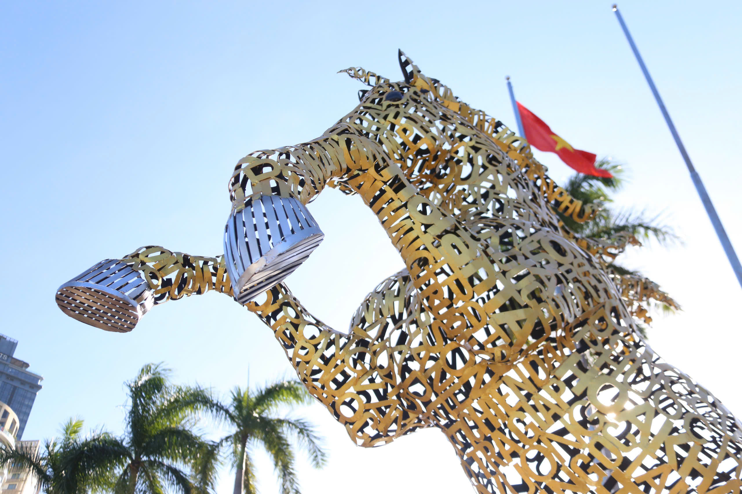 Linh vật ngựa màu vàng độc đáo Kim Mã Hợp Nhất tại Đà Nẵng được ghép từ tên của 94 xã, phường, đặc khu, đặt tại đường Bạch Đằng, phường Hải Châu.