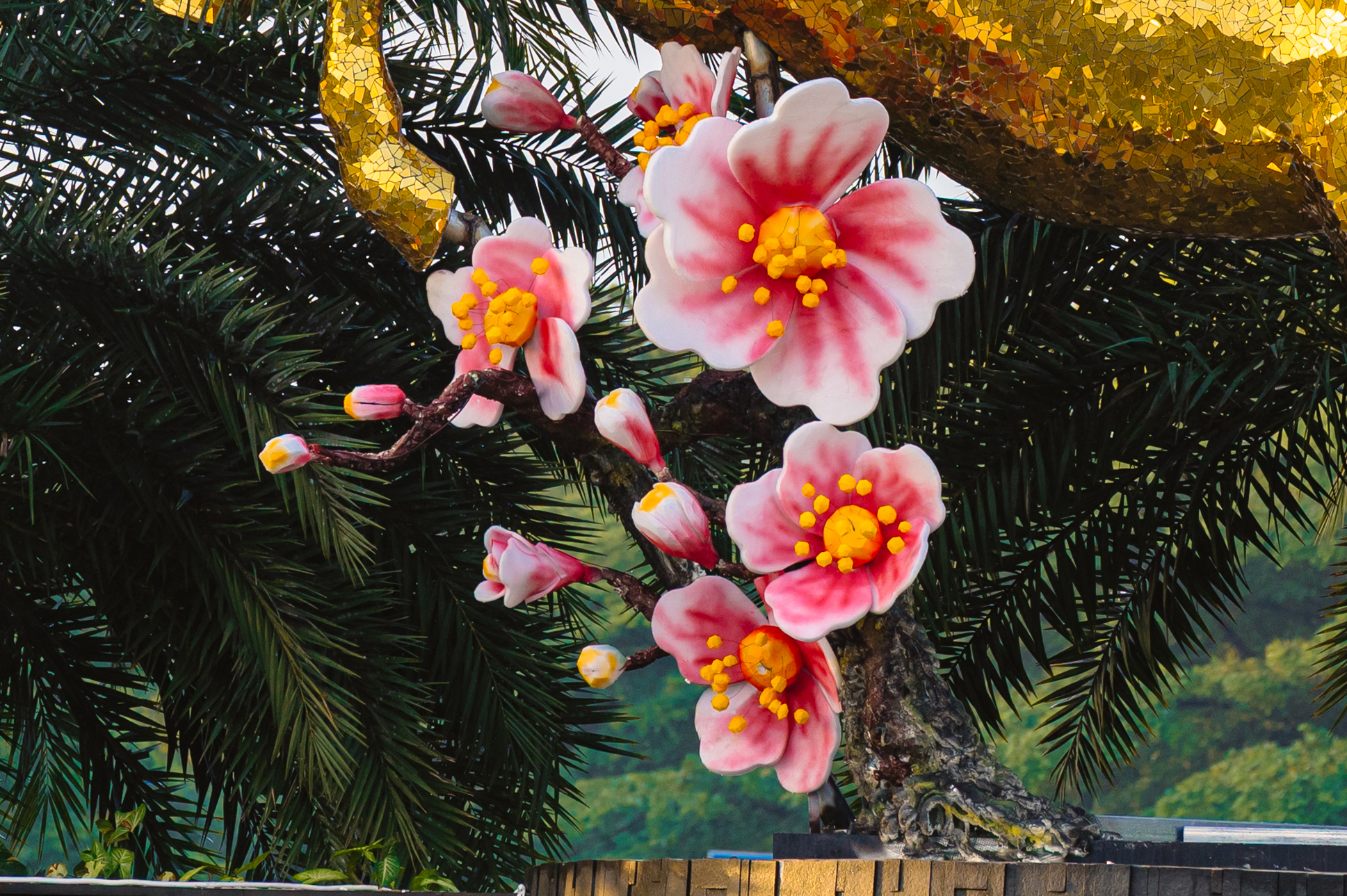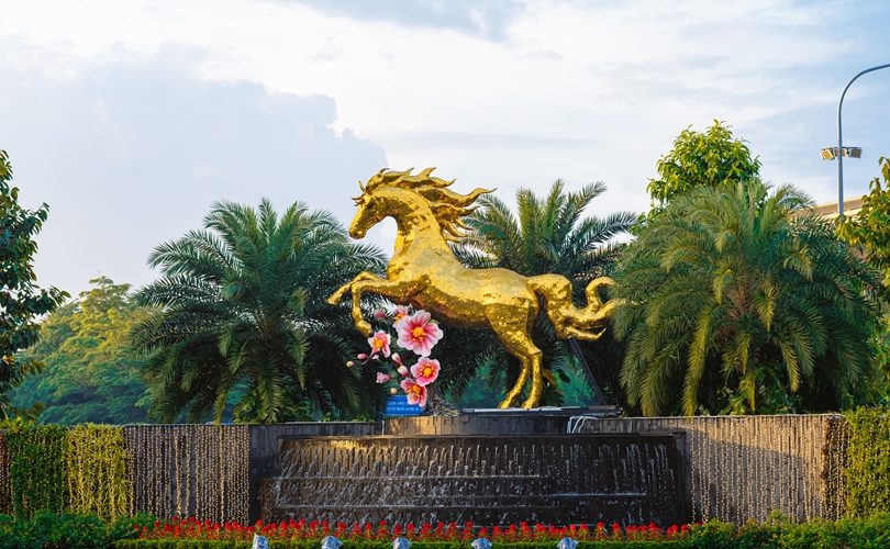 Tác phẩm được xây dựng dựa trên sự kiên cố của khung sắt chịu lực bên trong, bao phủ bởi hơn 60m² alu vàng rực rỡ. Đáng chú ý, để tạo nên bề mặt hoàn hảo và sống động, các nghệ nhân đã tỉ mỉ cắt ghép từ 150.000 tấm alu nhỏ, giúp linh vật vừa giữ được vẻ uy nghi, vững chãi, vừa tạo hiệu ứng phản chiếu ánh sáng lung linh, mang lại điểm nhấn thẩm mỹ dịu mắt cho không gian cửa ngõ hàng không.