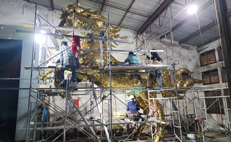 Để hoàn thành tác phẩm Ngựa Vàng cao 5m này, nghệ nhân Đinh Văn Tâm cùng đội ngũ cộng sự đã miệt mài làm việc xuyên suốt hơn một tháng ròng rã.