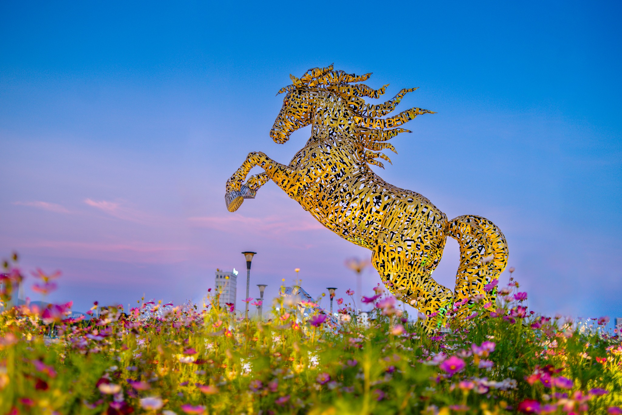 Linh vật ngựa sắt cao khoảng 4m xuất hiện bên bờ sông Hàn (Đà Nẵng), gây ấn tượng khi toàn bộ thân được ghép từ các mảnh sắt khắc tên 94 xã, phường, đặc khu của thành phố.