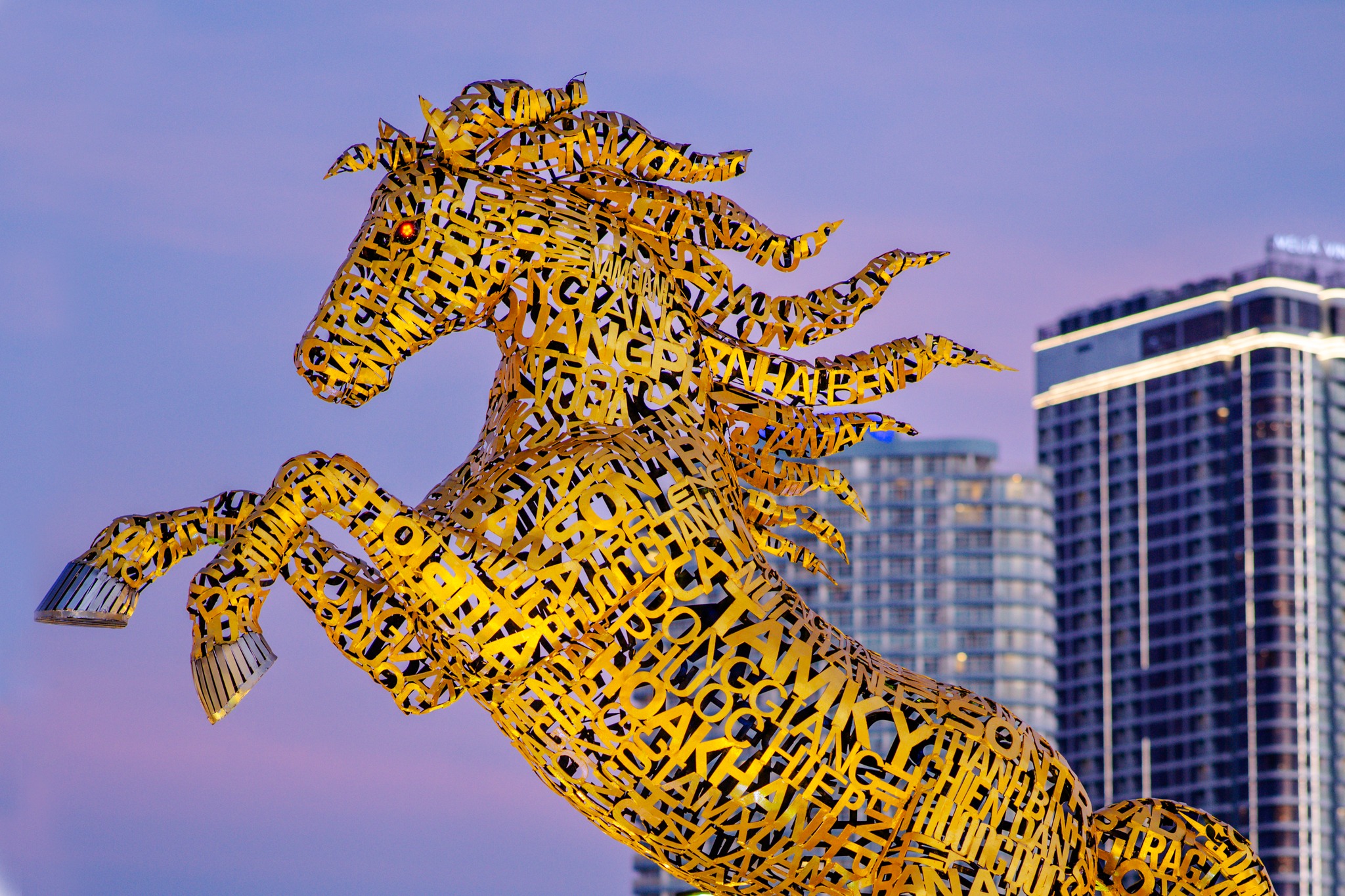 Linh vật Ngựa vàng cao khoảng 5m trưng bày tại Sân bay quốc tế Đà Nẵng, tạo hình tung vó mạnh mẽ, phủ hơn 60m2 tấm alu màu vàng với khoảng 150.000 mảnh ghép thủ công, tạo hiệu ứng ánh sáng lung linh, uy nghi.